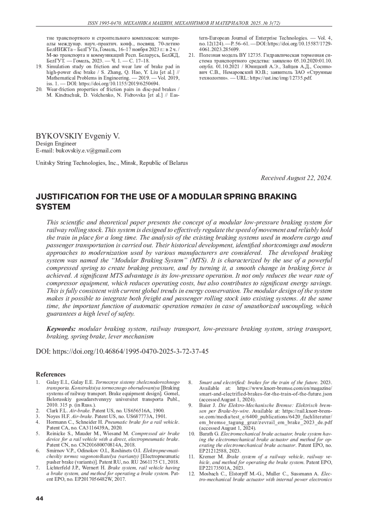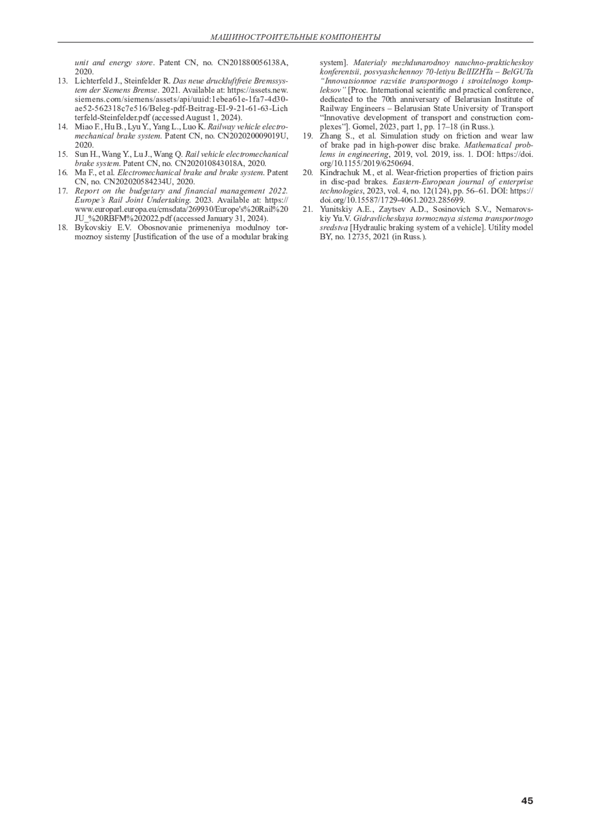 18. Быковский, Е.В. Обоснование применения модульной тормозной системы / Е.В. Быковский / Инновационное развитие транспортного и строительного комплексов: материалы междунар. науч.-практич. конф., посвящ. 70-летию БелИИЖТа - БелГУТа, Гомель, 16-17 ноября 2023 г.: в 2 ч. / М-во транспорта и коммуникаций Респ. Беларусь, БелЖД, БелГУТ. - Гомель, 2023. - Ч. 1. - С. 17-18.