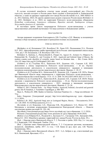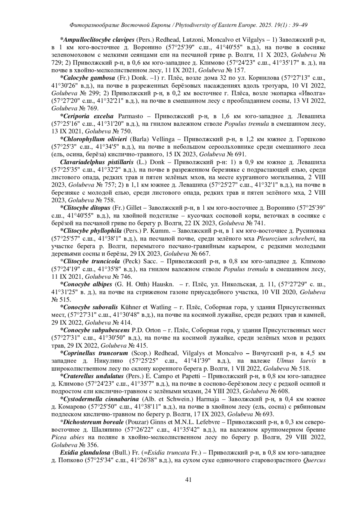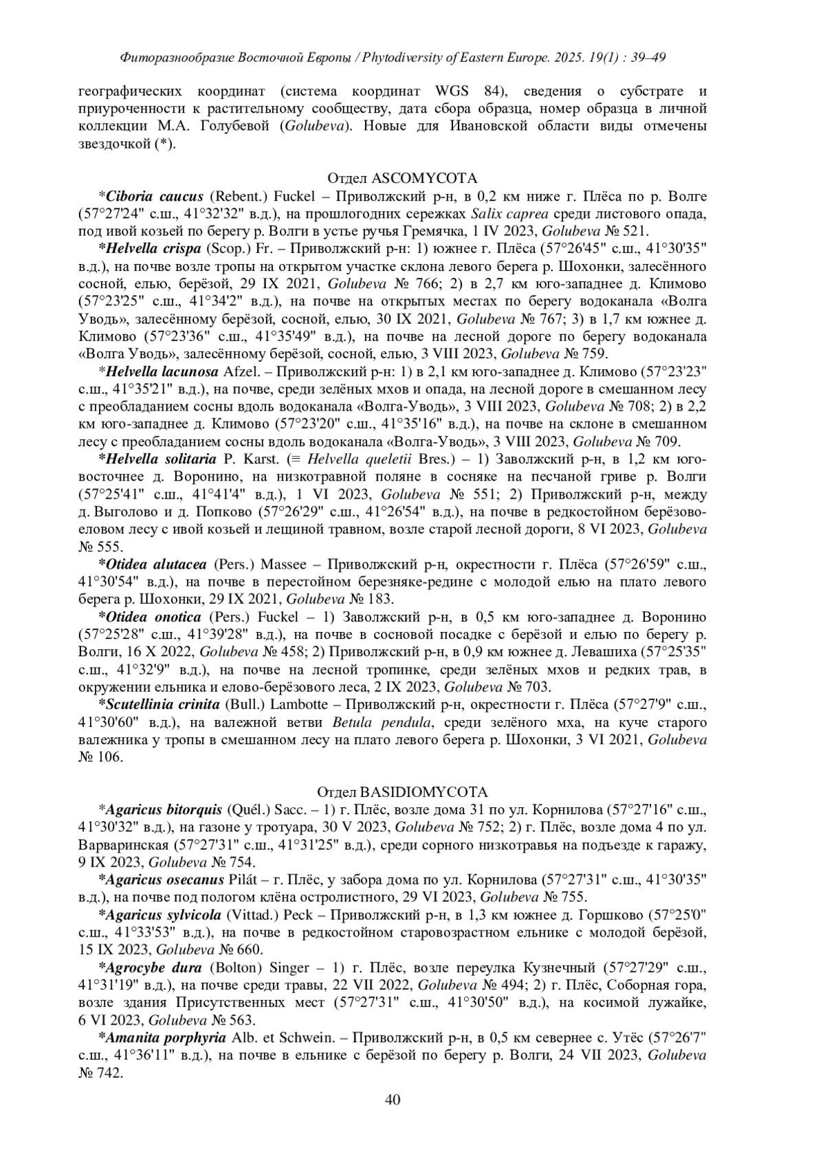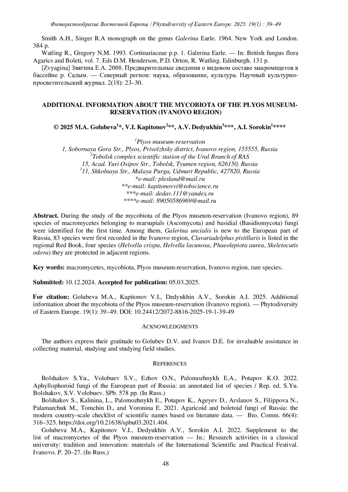 ГОЛУБЕВА М. А., КАПИТОНОВ В. И., ДЕДЮХИН А.В., СОРОКИН А. И. ДОПОЛНИТЕЛЬНЫЕ СВЕДЕНИЯ О МИКОБИОТЕ ПЛЁССКОГО МУЗЕЯ-ЗАПОВЕДНИКА (ИВАНОВСКАЯ ОБЛАСТЬ) // ФИТОРАЗНООБРАЗИЕ ВОСТОЧНОЙ ЕВРОПЫ. 2025. Т. 19 № 1 (17 СТ.)