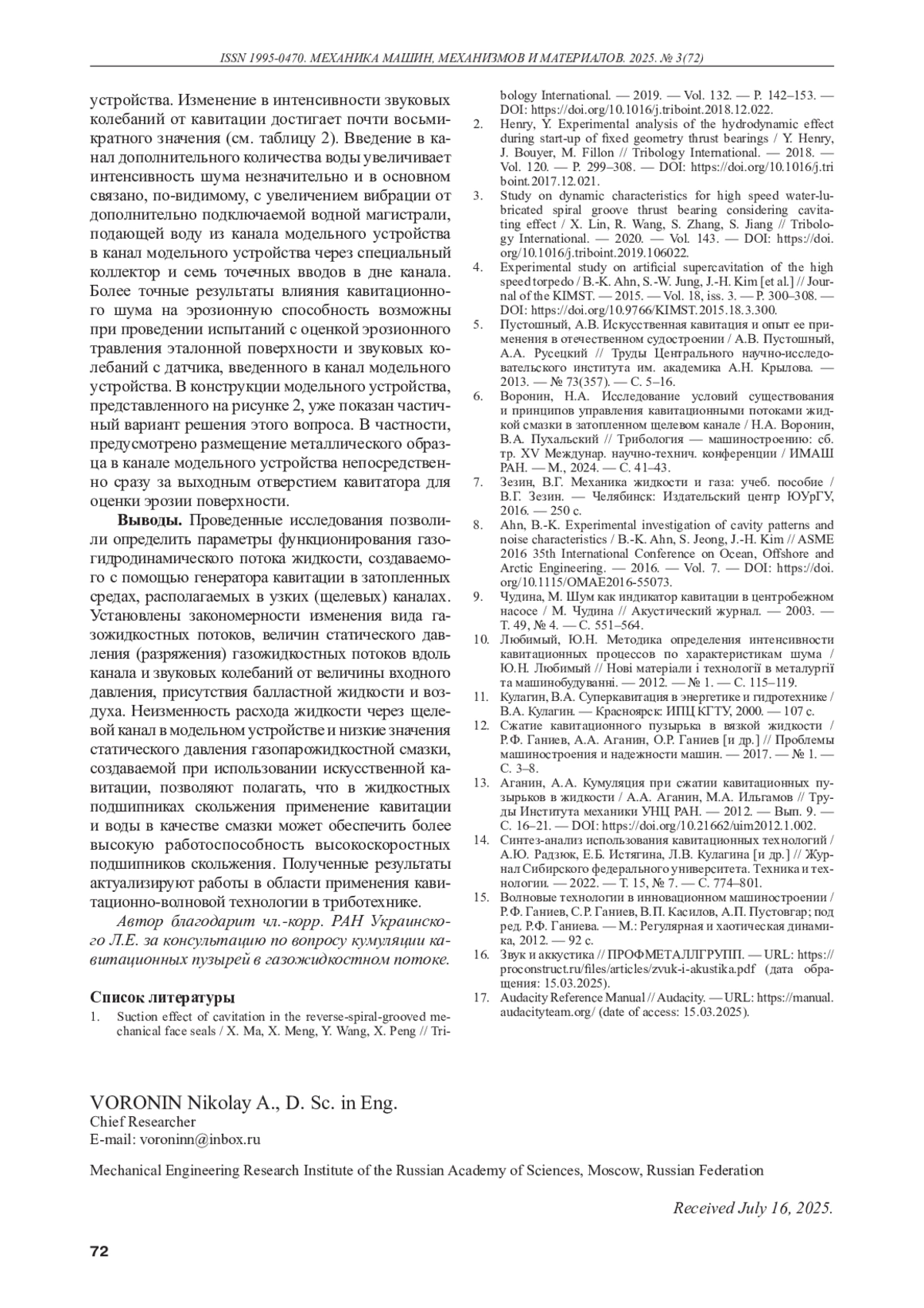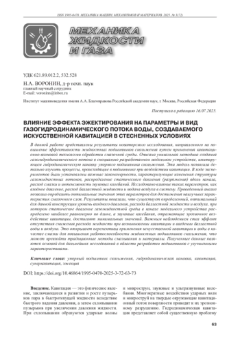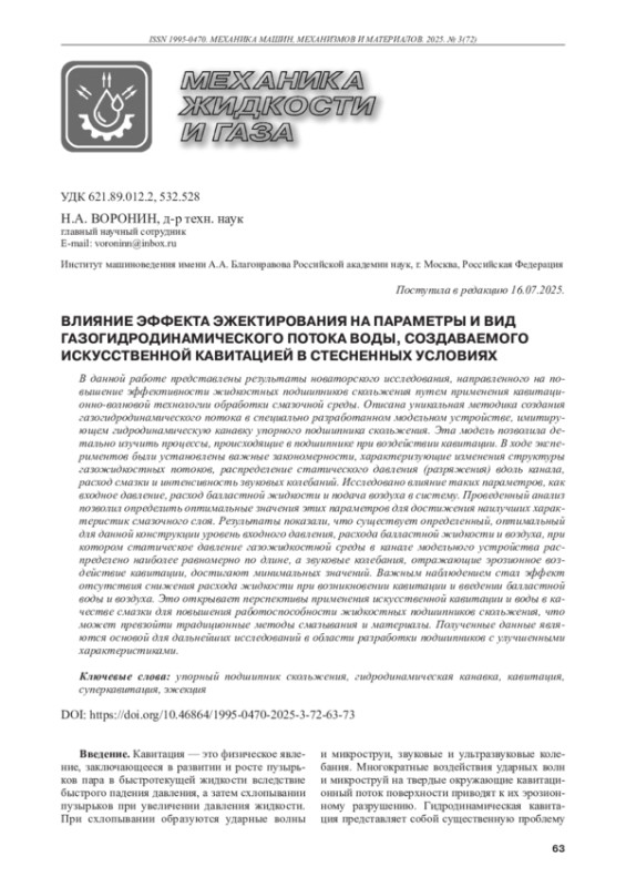 ВОРОНИН Н.А. ВЛИЯНИЕ ЭФФЕКТА ЭЖЕКТИРОВАНИЯ НА ПАРАМЕТРЫ И ВИД ГАЗОГИДРОДИНАМИЧЕСКОГО ПОТОКА ВОДЫ, СОЗДАВАЕМОГО ИСКУССТВЕННОЙ КАВИТАЦИЕЙ В СТЕСНЕННЫХ УСЛОВИЯХ // МЕХАНИКА МАШИН, МЕХАНИЗМОВ И МАТЕРИАЛОВ. 2025. № 3 (72)