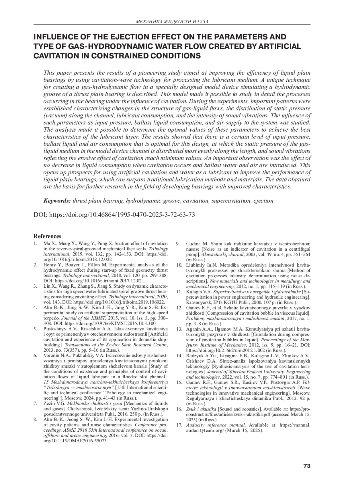 В данной работе представлены результаты новаторского исследования, направленного на повышение эффективности жидкостных подшипников скольжения путем применения кавитационно-волновой технологии обработки смазочной среды. Описана уникальная методика создания газогидродинамического потока в специально разработанном модельном устройстве, имитирующем гидродинамическую канавку упорного подшипника скольжения. Эта модель позволила детально изучить процессы, происходящие в подшипнике при воздействии кавитации. В ходе экспериментов были установлены важные закономерности, характеризующие изменения структуры газожидкостных потоков, распределение статического давления (разряжения) вдоль канала, расход смазки и интенсивность звуковых колебаний. Исследовано влияние таких параметров, как входное давление, расход балластной жидкости и подача воздуха в систему. Проведенный анализ позволил определить оптимальные значения этих параметров для достижения наилучших характеристик смазочного слоя. Результаты показали, что существует определенный, оптимальный для данной конструкции уровень входного давления, расхода балластной жидкости и воздуха, при котором статическое давление газожидкостной среды в канале модельного устройства распределено наиболее равномерно по длине, а звуковые колебания, отражающие эрозионное воздействие кавитации, достигают минимальных значений. Важным наблюдением стал эффект отсутствия снижения расхода жидкости при возникновении кавитации и введении балластной воды и воздуха. Это открывает перспективы применения искусственной кавитации и воды в качестве смазки для повышения работоспособности жидкостных подшипников скольжения, что может превзойти традиционные методы смазывания и материалы. Полученные данные являются основой для дальнейших исследований в области разработки подшипников с улучшенными характеристиками