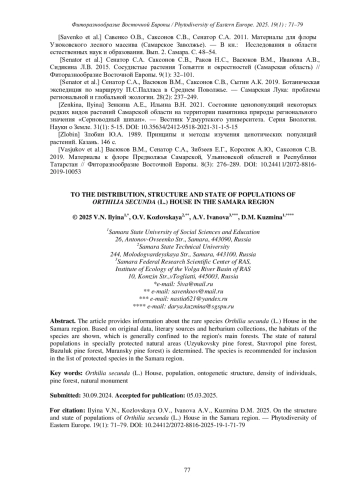 ИЛЬИНА В. Н., КОЗЛОВСКАЯ О. В., ИВАНОВА А. В., КУЗЬМИНА Д.М. К РАСПРОСТРАНЕНИЮ, СТРУКТУРЕ И СОСТОЯНИЮ ПОПУЛЯЦИЙ ORTHILIA SECUNDA (L.) HOUSE В САМАРСКОЙ ОБЛАСТИ // ФИТОРАЗНООБРАЗИЕ ВОСТОЧНОЙ ЕВРОПЫ. 2025. Т. 19 № 1 (17 СТ.)
