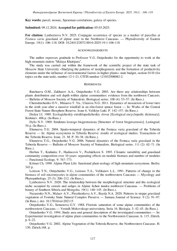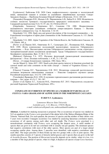 10. [Lyubeznova] Любезнова Н.В. 2020 Связь морфологического строения и экологической ниши, занимаемой злаками и осоками на альпийских лишайниковых пустошах Северо-Западного Кавказа - Проблемы ботаники Южной Сибири и Монголии. 19 (1): 140-145. EDN: SKOEBQ