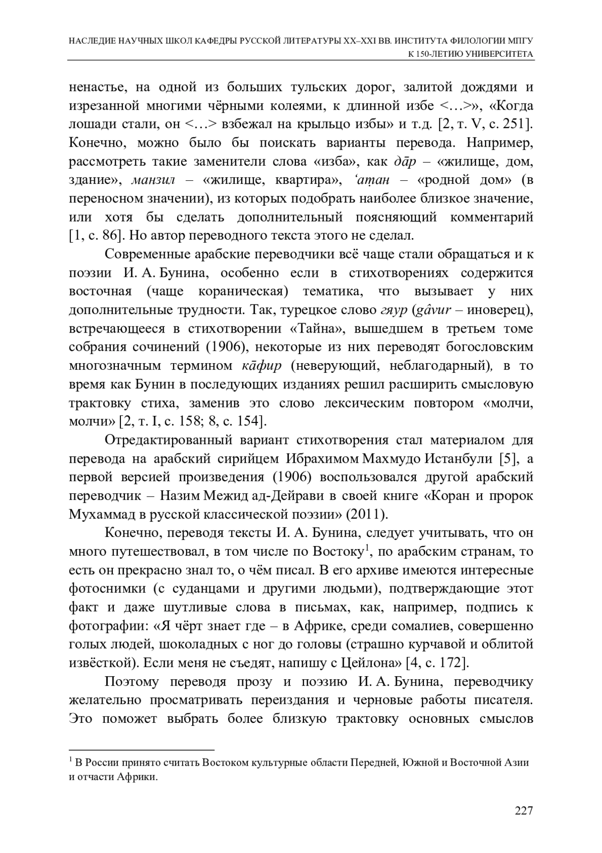 Таирова И.А. Смысловые и формальные трансформации художественных текстов И. А. Бунина в переводах на арабский язык // Наследие научных школ кафедры русской литературы XX-XXI вв. Института филологии МПГУ. К 150-летию университета. Материалы XXVII Шешуковских чтений. Под общей редакцией Л.А. Трубиной, сост. Л.А. Трубина, Д.В. Поль, И.С. Урюпин. Москва: МПГУ, 2023. С. 224-229.
