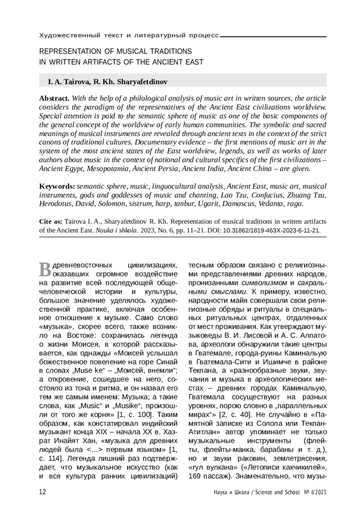 Таирова И.А., Шаряфетдинов Р.Х. РЕПРЕЗЕНТАЦИЯ МУЗЫКАЛЬНЫХ ТРАДИЦИЙ В ПИСЬМЕННЫХ ПАМЯТНИКАХ ДРЕВНЕГО ВОСТОКА