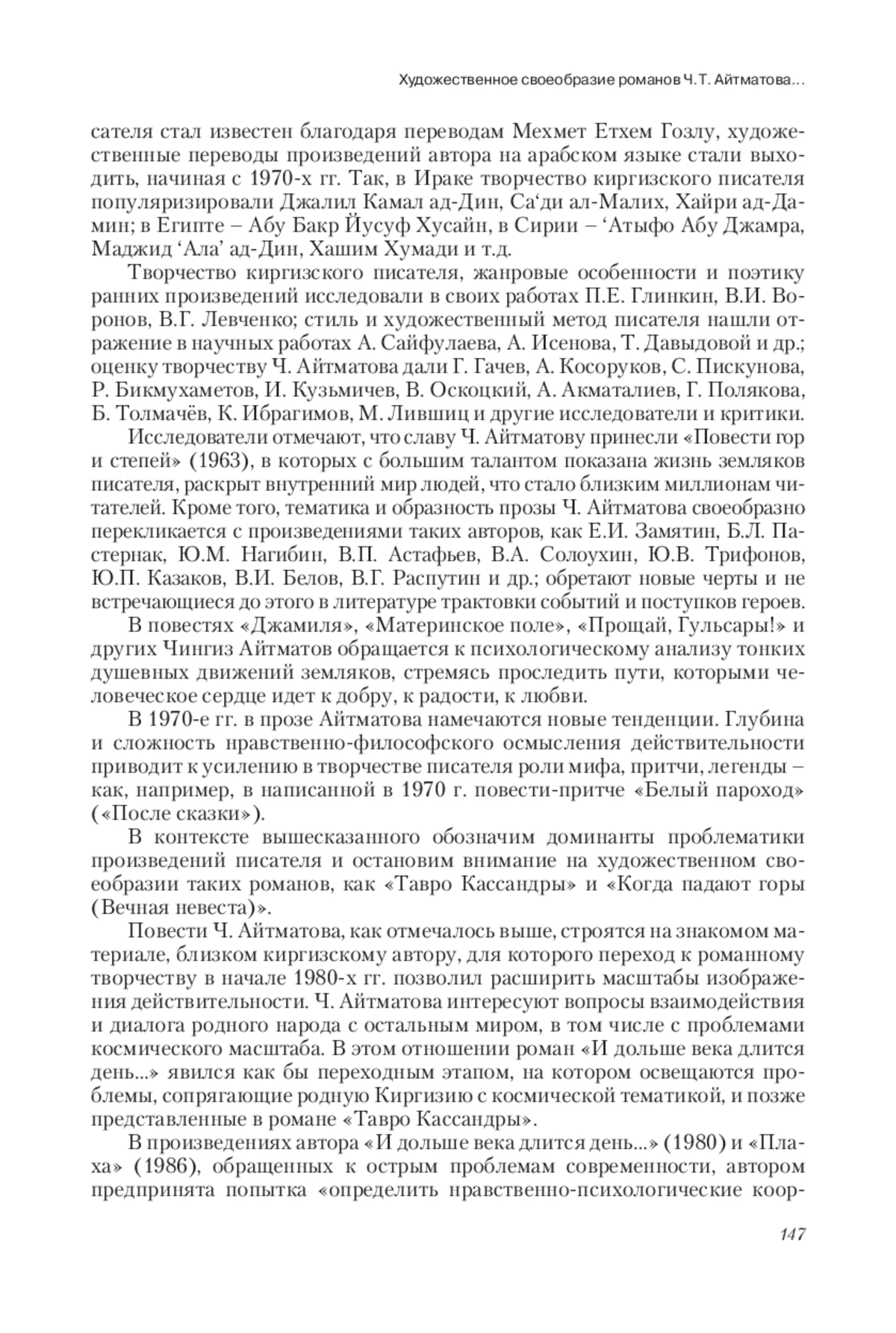 В статье рассмотрены художественные особенности произведений киргизского писателя Чингиза Айтматова, проанализирована история переводов и научных исследований его произведений. Прослежена эволюция авторского стиля: от психологизма ранних повестей к глубокому нравственно-философскому осмыслению действительности в позднем творчестве. Авторы отмечают, что роман «Тавро Кассандры» значительно отличается от всех предыдущих произведений писателя своей космической масштабностью и обращением к глобальным проблемам современного мира, полного трагических событий, бедствий и катастроф. В романе обнаружено три концентра (российский, американский, космический), оппозиция Космоса и Хаоса, а также архетипические образы природных стихий, животных и птиц, с помощью которых писатель выражает опасение за будущее человечества. Авторы выявили, что в романе «Когда па дают горы (Вечная невеста)» писатель актуализирует притчи, легенды, научную фантастику, а изображение строится в двух плоскостях: горизонтальной (Человек – животный мир – мифологические миры) и вертикальной (Земля – Небо – Космос). Акцентируется внимание на том, что, несмотря на различие тематики и проблематики произведений, Айтматов остается верен принципам изображения главных героев –правдолюбцев и максималистов. И хотя в большинстве произведений финал трагичен, тем не менее, творения писателя оптимистичны и вселяют надежду на положительные изменения в обществе в будущем. Анализ последних романов Айтматова показывает, что их отличает универсализм, переплетение мифа с реальностью и глубина философского осмысления действительности. В своих произведениях он не только обращается к истории, мифологии, фольклору, фантастике, но и сопрягает мировые проблемы современности с жизнью родного аула.