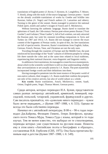 В статье раскрывается многогранный переводческий опыт И. А. Бунина, начиная с ранних работ – перевода английской поэзии (Дж. Бай рона, Ф. Гименс, Г. Лонгфелло, Т. Мура, Т. Гуда), попутно изучая язык источника; немецкой поэзии – с опорой на уже имевшиеся переводы произведений Гёте и Шиллера на русский язык; итальянских (А. Негри), французских авторов (А. Ламартина и других). Обращаясь к жанру соне та, Бунину удалось сохранить национальный польский дух, мотивы и ав торские образы А. Асныка и А. Мицкевича. Не владея аутентичным языком, И. А. Бунин дерзнул перевести афоризмы Саади, персидского поэта XIII в., чьи поэмы Бустан («Плодовый сад») и Гулистан («Розовый сад»), полные суфийской мудрости, не просто привлекали русского поэта, а являлись его неизменными попутчиками в путешествиях по Сирии и Турции (в 1907 и 1913 гг.). Несмотря на то, что И. А. Бунину не довелось передать точное содержание фрагментов персидских сочинений, его вольные переводы полны особенных до стоинств. Однако переводами с английского, итальянского, немецкого, фран цузского, персидского, татарского, украинского языков не исчерпывает ся переводческая деятельность И. А. Бунина. Путешествуя по странам Европы и Ближнего Востока, поэт подкрепил свои знания «книжных» культур разных народов увиденной там жизнью вне колорита и в то же время связанной с местными традициями, прочувствовав их националь ный характер, внеязыковую и языковую действительность. Помимо вольных переводов ему удалось создать собственные шедевры, о которых в научном мире до сих пор нет чёткого понимания, яв ляются ли они переводами или это собственно стихотворения И. А. Бунина. В них поэт мастерски вкрапил иноязычные слова и их дефиниции. Сумев проникнуть во внутреннюю суть поэтического мира неродных ему культур, их образный ряд, И. А. Бунин сделал их реалии достоянием не только своей творческой деятельности, но и мировой культу ры в целом.