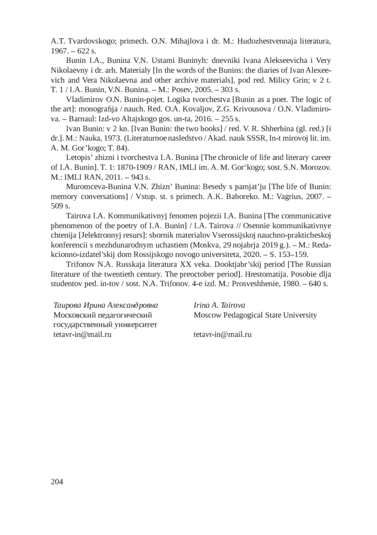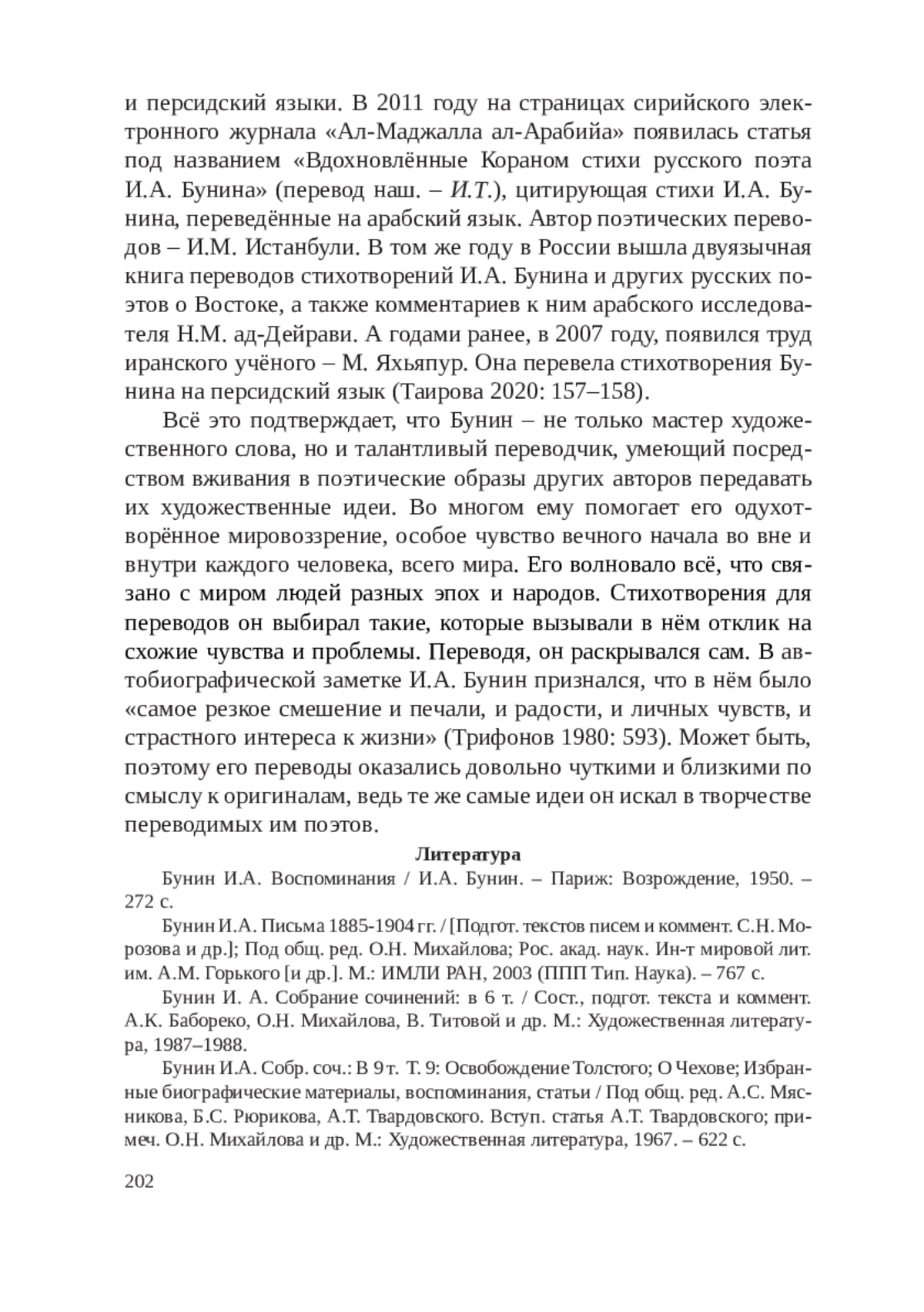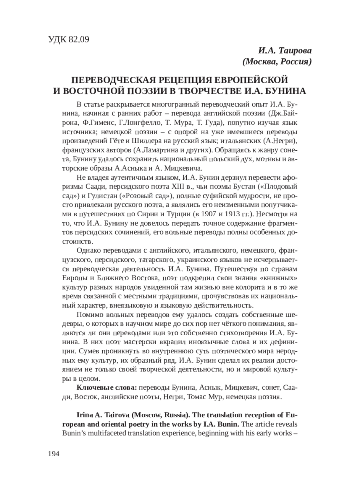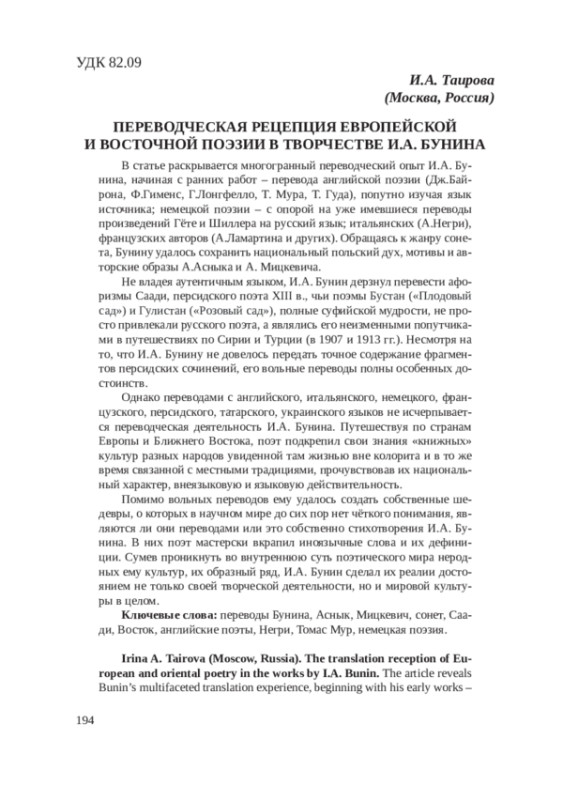 ТАИРОВА И. ПЕРЕВОДЧЕСКАЯ РЕЦЕПЦИЯ ЕВРОПЕЙСКОЙ И ВОСТОЧНОЙ ПОЭЗИИ В ТВОРЧЕСТВЕ И. А. БУНИНА // ЯЗЫК, КОММУНИКАЦИЯ И СОЦИАЛЬНАЯ СРЕДА