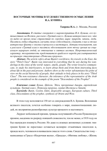 Таирова И.А. ВОСТОЧНЫЕ МОТИВЫ В ХУДОЖЕСТВЕННОМ ОСМЫСЛЕНИИ И.А. БУНИНА // ГУМАНИТАРНЫЕ ТЕХНОЛОГИИ В СОВРЕМЕННОМ МИРЕ : Сборник статей VIII международной научно-практической конференции. В 2-х частях. Том Часть 1. Составители Л.М. Гончарова, Т.В. Нестерова, Э.А. Китанина. 2020. С. 487-493.
