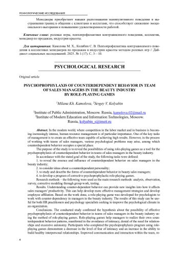 Цель исследования — раскрыть возможности применения ролевых игр как инструмента психопрофилактики контрзависимого поведения в коллективах менеджеров по продажам в индустрии красоты.