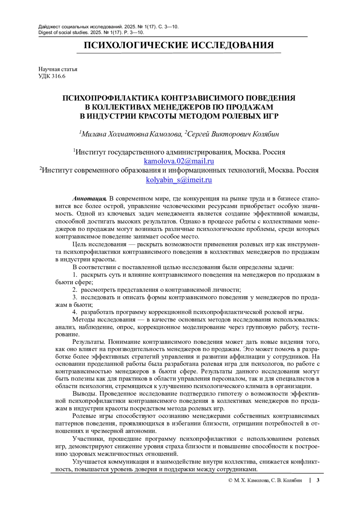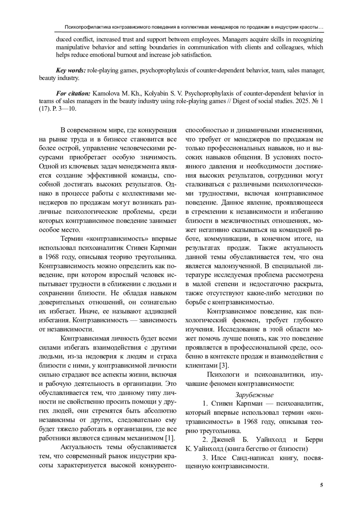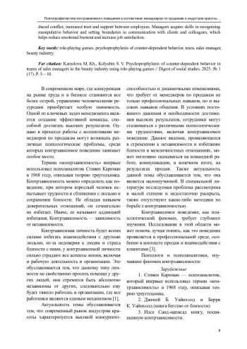 Выводы. Проведенное исследование подтвердило гипотезу о возможности эффектив-ной психопрофилактики контрзависимого поведения в коллективах менеджеров по продажам в индустрии красоты посредством метода ролевых игр.