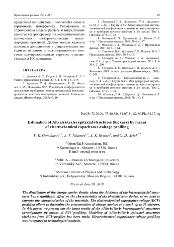 V. E. Goncharov, A. V. Nikonov, A. K. Ilyasov, and O. D. Arich Estimation of AlGaAs/GaAs epitaxial structures thickness by means of electrochemical capaci-tance-voltage profiling 61