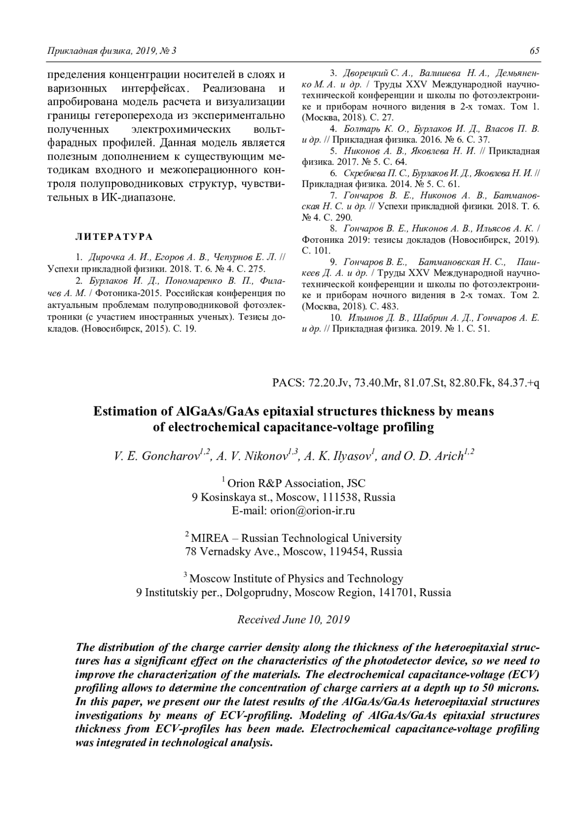 Гончаров В. Е., Никонов А. В., Ильясов А. К., Арич О. Д. Определение толщины эпитаксиальных слоев гетеропары AlGaAs/GaAs методом электрохимического вольт-фарадного профилирования 61