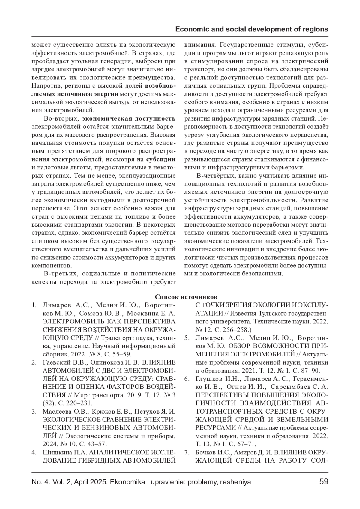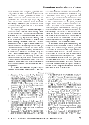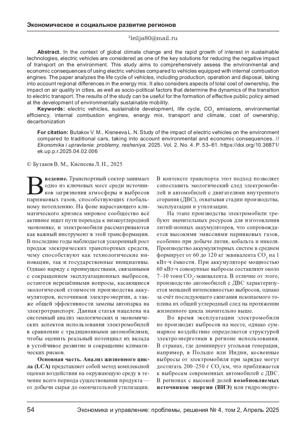 В условиях глобального изменения климата и стремительного роста интереса к устойчивым технологиям, электромобили рассматриваются как одно из ключевых решений для снижения негативного воздействия транспорта на окружающую среду. Настоящее исследование направлено на всестороннюю оценку экологических и экономических последствий использования электромобилей по сравнению с автомобилями, оснащёнными двигателями внутреннего сгорания. В работе проводится анализ жизненного цикла транспортных средств, включая производство, эксплуатацию и утилизацию, с учётом региональных различий в энергетическом миксе. Также рассматриваются аспекты совокупной стоимости владения, влияние на качество воздуха в городах, а также социально - политические факторы, определяющие динамику перехода к электрическому транспорту. Результаты исследования могут быть полезны для формирования эффективной государственной политики, направленной на развитие экологически устойчивой мобильности.