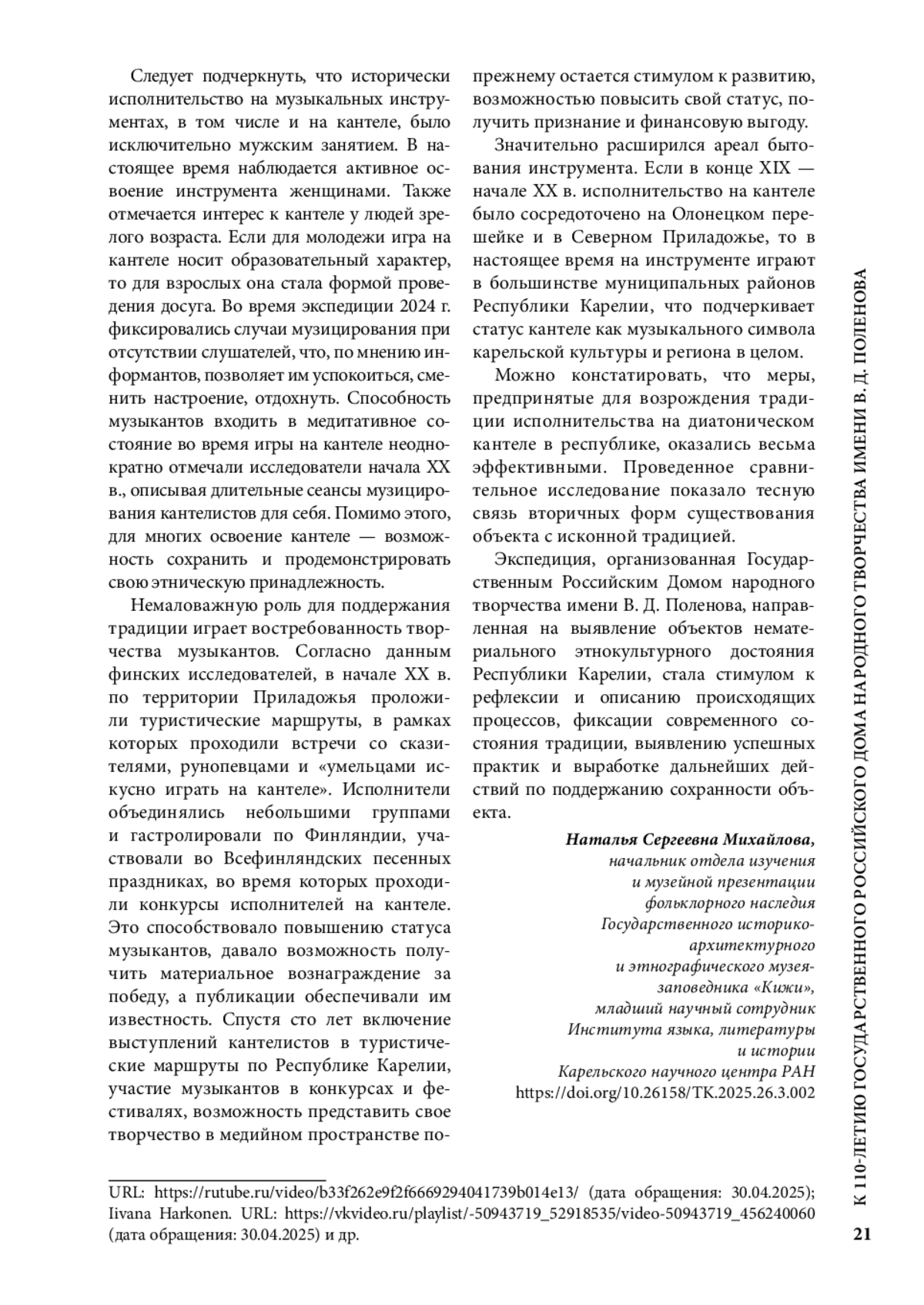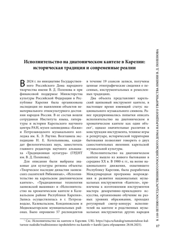 МИХАЙЛОВА Н. С. ИСПОЛНИТЕЛЬСТВО НА ДИАТОНИЧЕСКОМ КАНТЕЛЕ В КАРЕЛИИ: ИСТОРИЧЕСКАЯ ТРАДИЦИЯ И СОВРЕМЕННЫЕ РЕАЛИИ // ТРАДИЦИОННАЯ КУЛЬТУРА. 2025. № 3, ТОМ 26