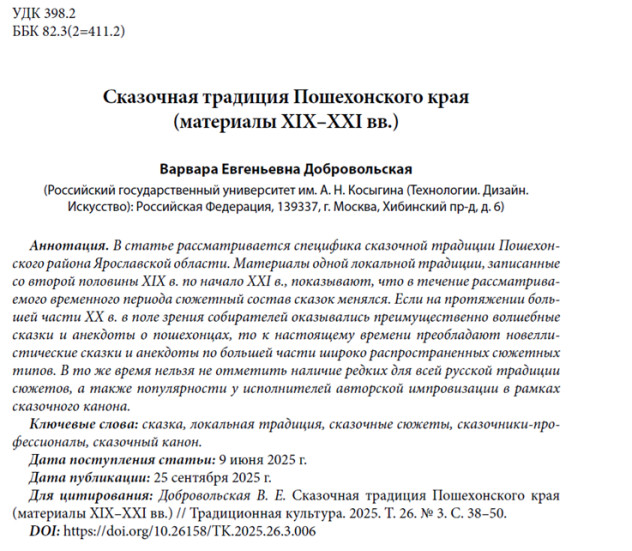 ДОБРОВОЛЬСКАЯ В. Е. СКАЗОЧНАЯ ТРАДИЦИЯ ПОШЕХОНСКОГО КРАЯ (МАТЕРИАЛЫ XIX–XXI ВВ.) // ТРАДИЦИОННАЯ КУЛЬТУРА. 2025. № 3, ТОМ 26