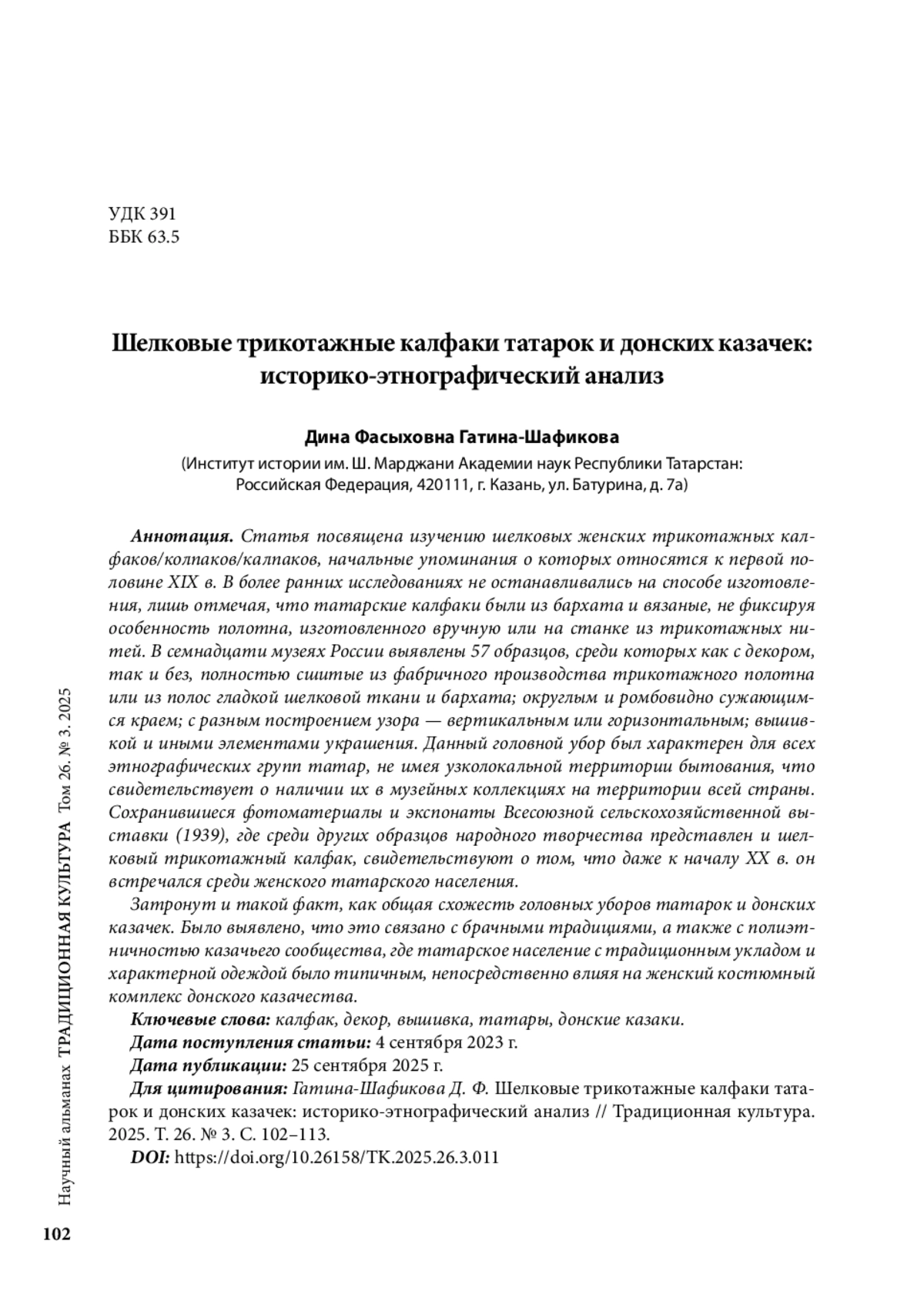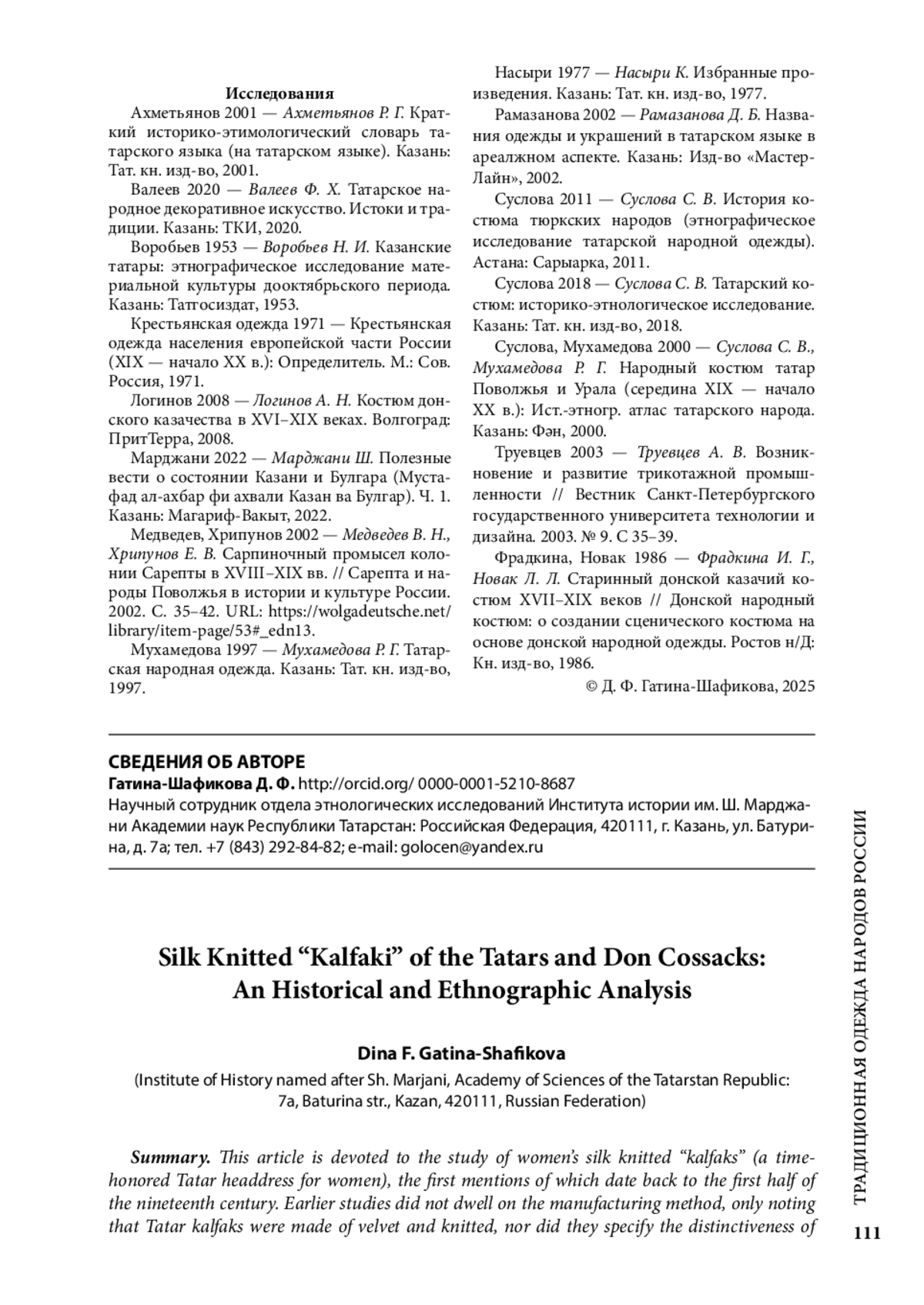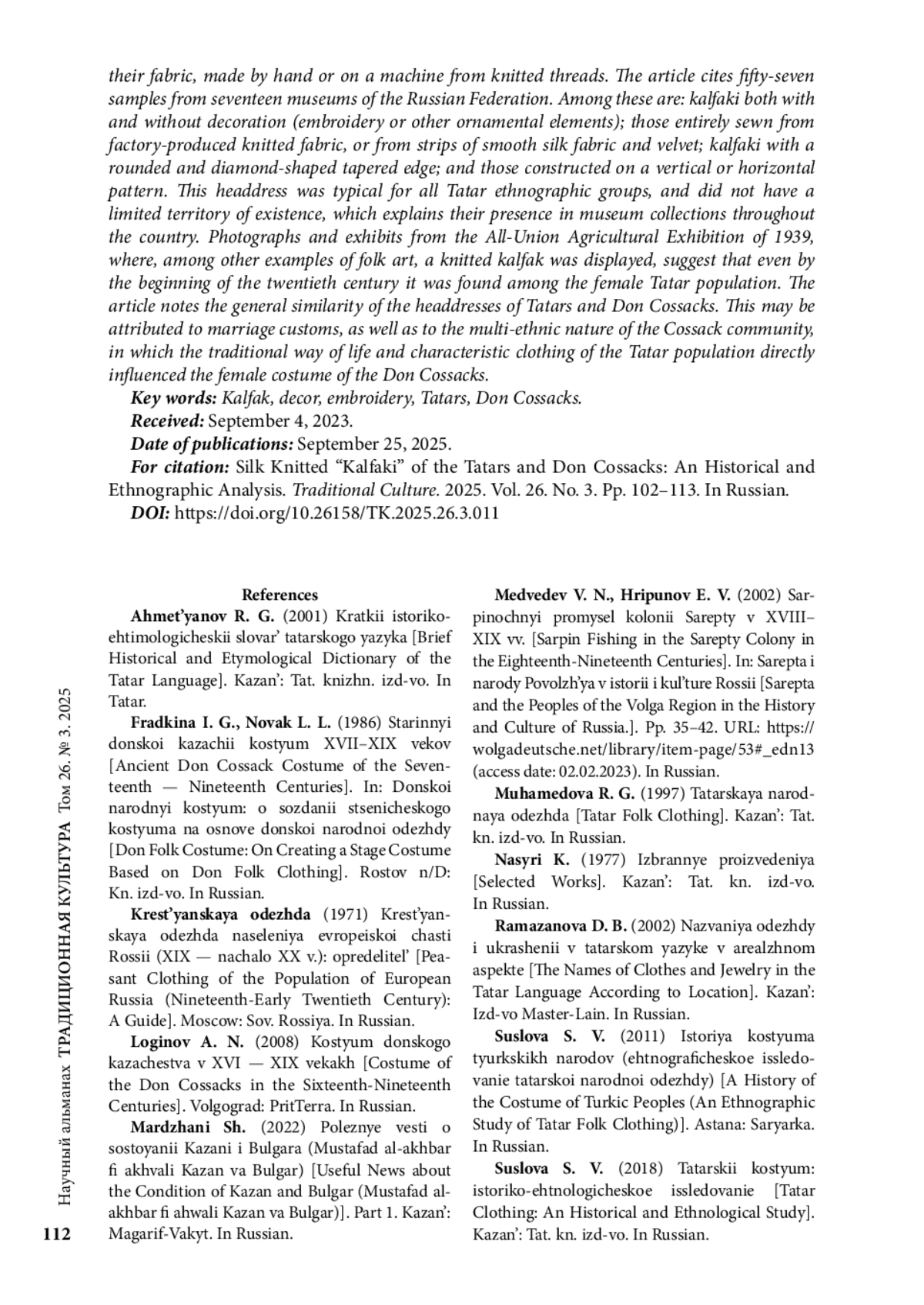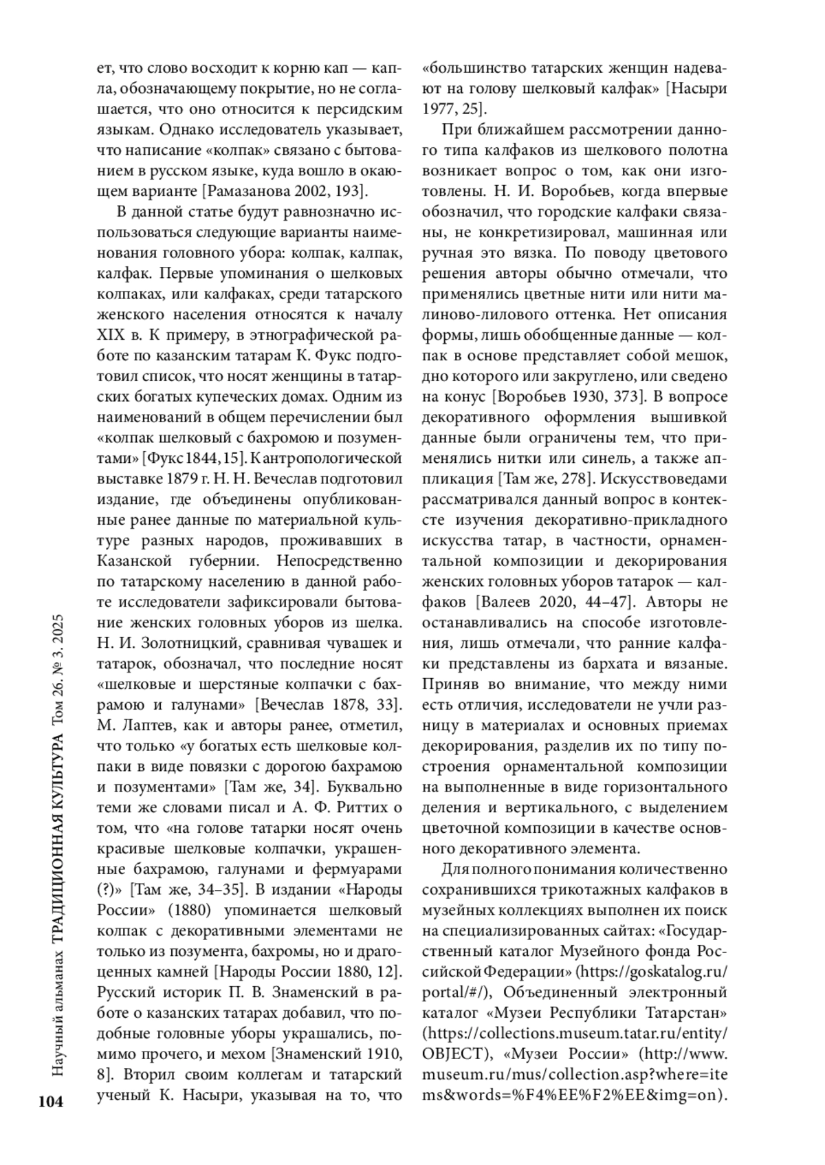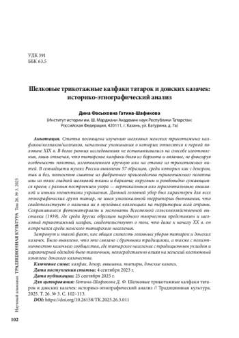 Статья посвящена изучению шелковых женских трикотажных калфаков/колпаков/калпаков, начальные упоминания о которых относятся к первой половине XIX в. В более ранних исследованиях не останавливались на способе изготовления, лишь отмечая, что татарские калфаки были из бархата и вязаные, не фиксируя особенность полотна, изготовленного вручную или на станке из трикотажных нитей. В семнадцати музеях России выявлены 57 образцов, среди которых как с декором, так и без, полностью сшитые из фабричного производства трикотажного полотна или из полос гладкой шелковой ткани и бархата; округлым и ромбовидно сужающимся краем; с разным построением узора — вертикальным или горизонтальным; вышивкой и иными элементами украшения. Данный головной убор был характерен для всех этнографических групп татар, не имея узколокальной территории бытования, что свидетельствует о наличии их в музейных коллекциях на территории всей страны. Сохранившиеся фотоматериалы и экспонаты Всесоюзной сельскохозяйственной выставки (1939), где среди других образцов народного творчества представлен и шелковый трикотажный калфак, свидетельствуют о том, что даже к началу ХХ в. он встречался среди женского татарского населения.