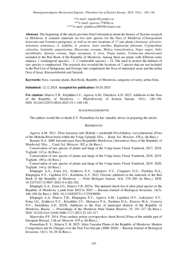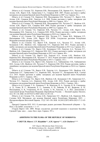 8. [Khapugin et al.] А.А. Хапугин, Т.Б. Силаева, С.В. Хапугина, А.М. Агеева, О.В. Лапшина, С.В. Лукиянов, И.Г. Есина, Е.В. Ершкова, И.В. Кирюхин, П.А. Моисеева, Д.А. Паршина, М.А. Киреев, Н.В. Уразова, А.Д. Синичкина. 2023b. Дополнения к флорам муниципальных районов Республики Мордовия (Россия). - Труды Мордовского государственного природного заповедника имени П. Г. Смидовича. 32: 181-217. DOI: 10.24412/cl-31646-2686-7117-2023-32-181-217 EDN: TFRGIR