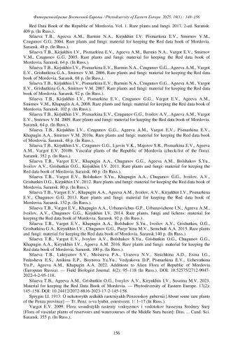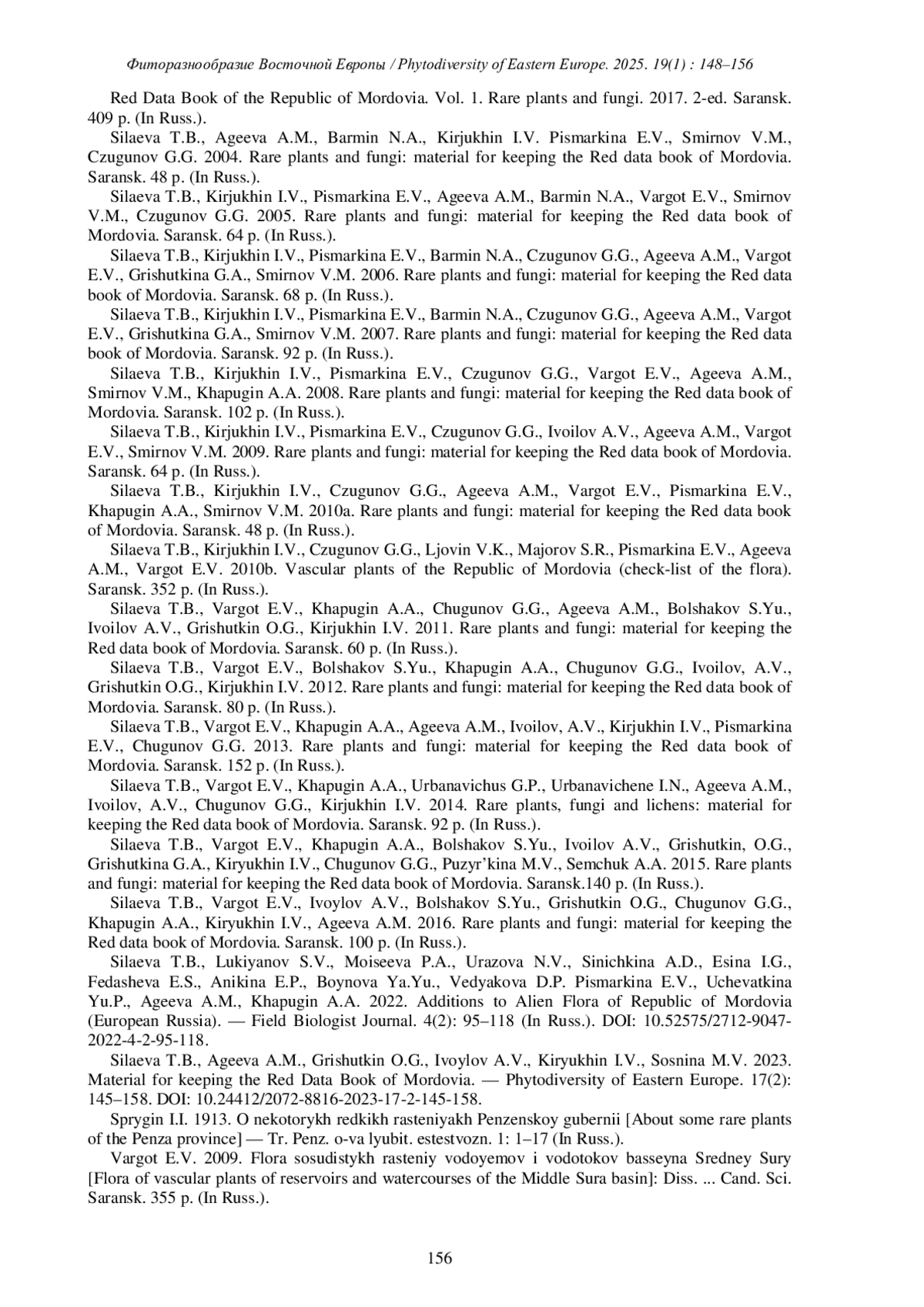 21. [Silaeva et al.] Силаева Т.Б., Варгот Е.В., Хапугин А.А., Агеева А.М., Ивойлов А.В., Кирюхин И.В., Письмаркина Е.В., Чугунов Г.Г. 2013. Редкие растения и грибы: материалы для ведения Красной книги Республики Мордовия за 2013 г. Саранск. 152 c. EDN: UPVROH