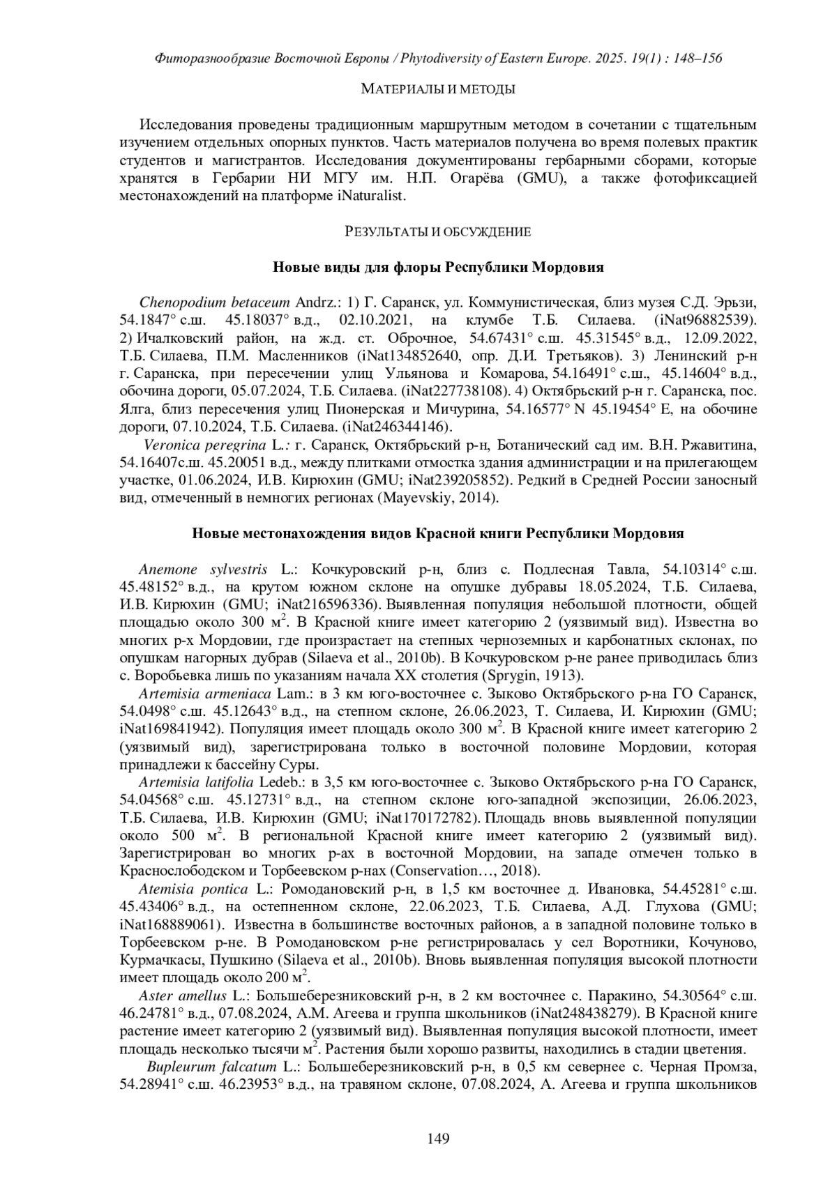 25. [Silaeva et al.] Силаева, Т. Б., Лукиянов, С. В., Моисеева, П. А., Уразова, Н. В., Синичкина, А. Д., Есина, И. Г., Федашева, Е. С., Аникина, Е. П., Бойнова, Я. Ю., Ведякова, Д. П., Письмаркина, Е. В., Учеваткина, Ю. П., Агеева, А. М., Хапугин, А. А. 2022. Дополнения к чужеземной флоре Республики Мордовия (Европейская Россия). - Полевой журнал биолога. 4(2): 95-118. DOI: 10.52575/2712-9047-2022-4-2-95-118 EDN: XJLFKK