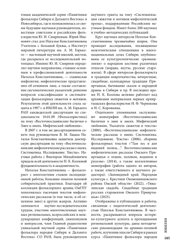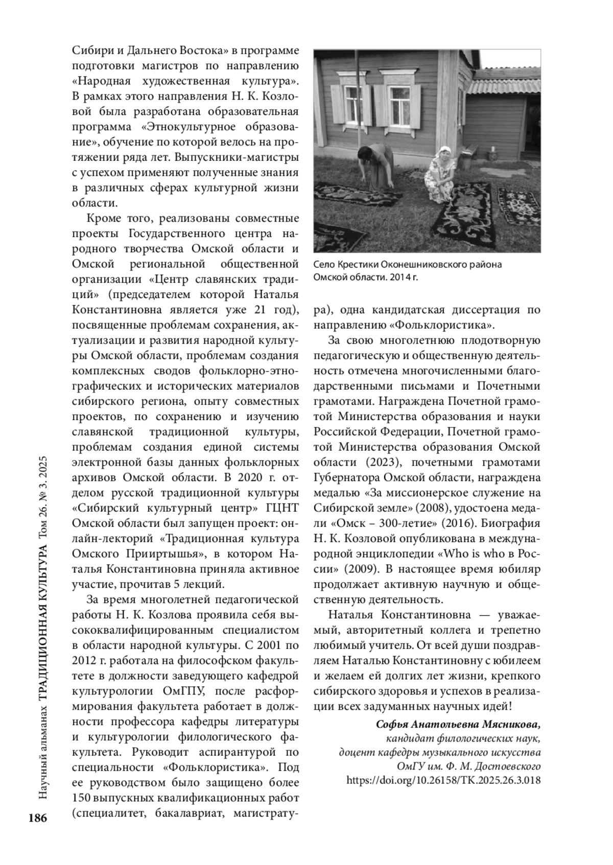 Имя Натальи Константиновны Козловой хорошо известно в научных фольклористических кругах. Сибирский фольклорист, доктор филологических наук, профессор кафедры литературы и культурологии Омского государственного педагогического университета, доцент, председатель Омской областной общественной организации «Центр славянских традиций», член Консультативного совета по национальным и межконфессиональным отношениям при Губернаторе Омской области; член Экспертного совета по делам национальностей и религий при Администрации г. Омска; заместитель председателя областной комиссии по нематериальному этнокультурному достоянию при Министерстве культуры Омской области; член Художественноэкспертного совета по народным художественным промыслам — список регалий можно продолжать еще долго.