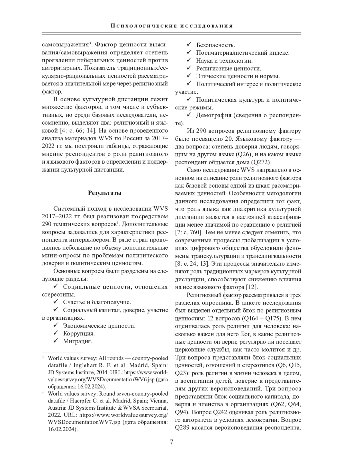Р. Инглхарт переосмыслил теорию модернизации, доказав, что с ростом экзистенциальной безопасности в современном обществе постматериалистические ценности неизбежно трансформируются в ценности светские и ценности самовыражения. Всемирное исследование ценностей 2017-2022 гг. проводилось по 290 тематическим вопросам. В результате было выявлено, что показатели отношений к другим расам, национальностям, носителям других языков тесно взаимосвязаны с религиозным фактором. В данной классификации религиозный фактор является базовым для определения культурной дистанции, что и доказывается результатами исследования по России. В российских условиях религиозн ый фактор становится еще более весомым в силу того, что большинство респондентов признают, что религия и рели гиозные институты играют либо значимую, либо важную роль в их жизни.