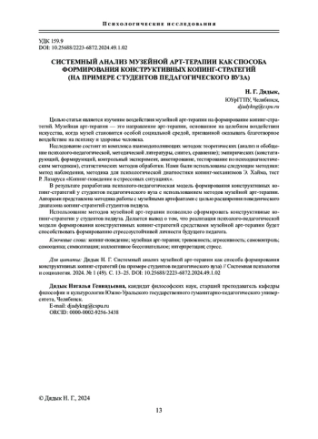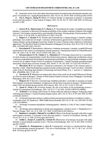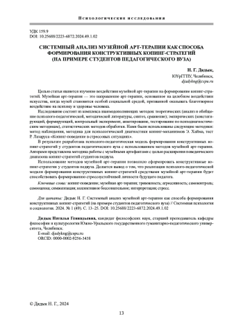 Статья: СИСТЕМНЫЙ АНАЛИЗ МУЗЕЙНОЙ АРТ-ТЕРАПИИ КАК СПОСОБА ФОРМИРОВАНИЯ КОНСТРУКТИВНЫХ КОПИНГ-СТРАТЕГИЙ (НА ПРИМЕРЕ СТУДЕНТОВ ПЕДАГОГИЧЕСКОГО ВУЗА) (2024)