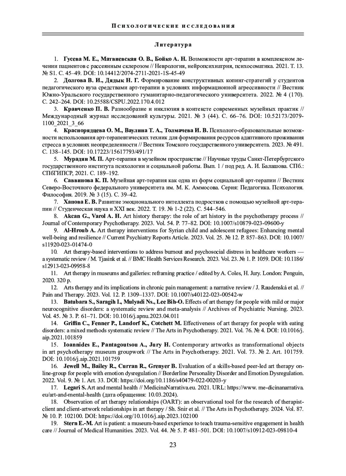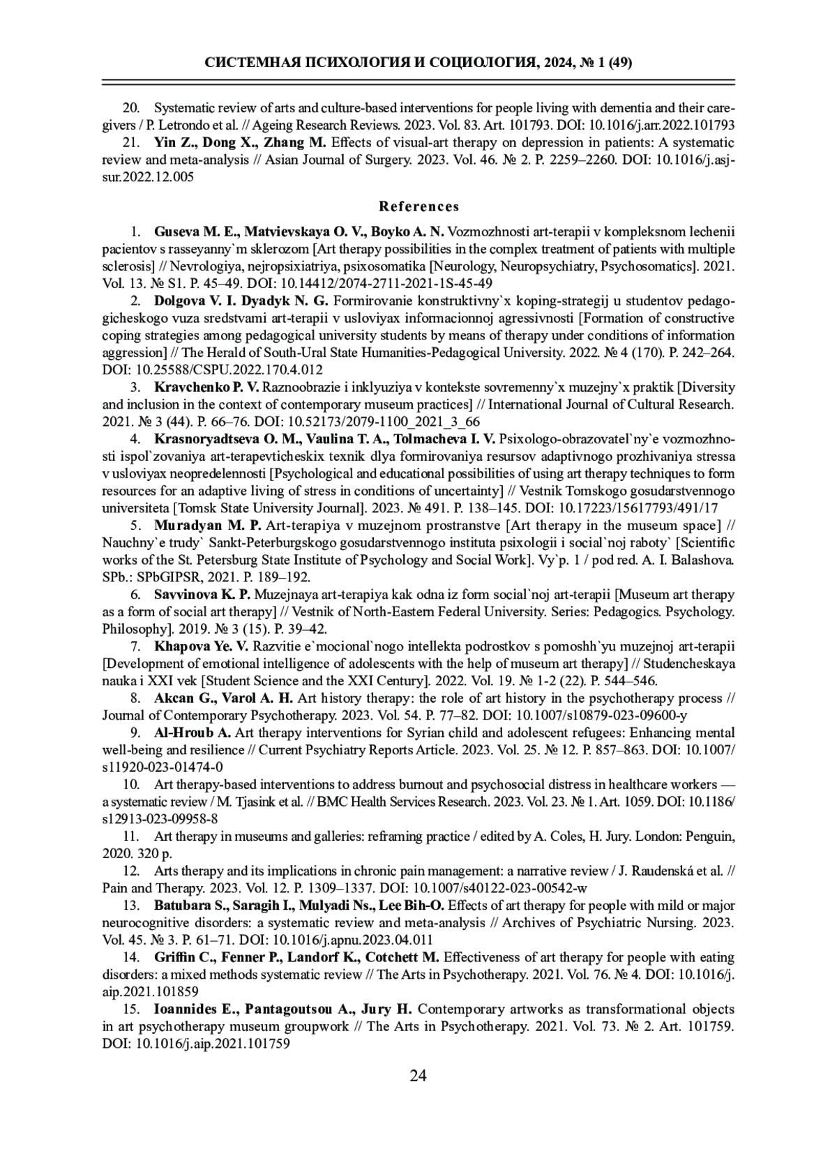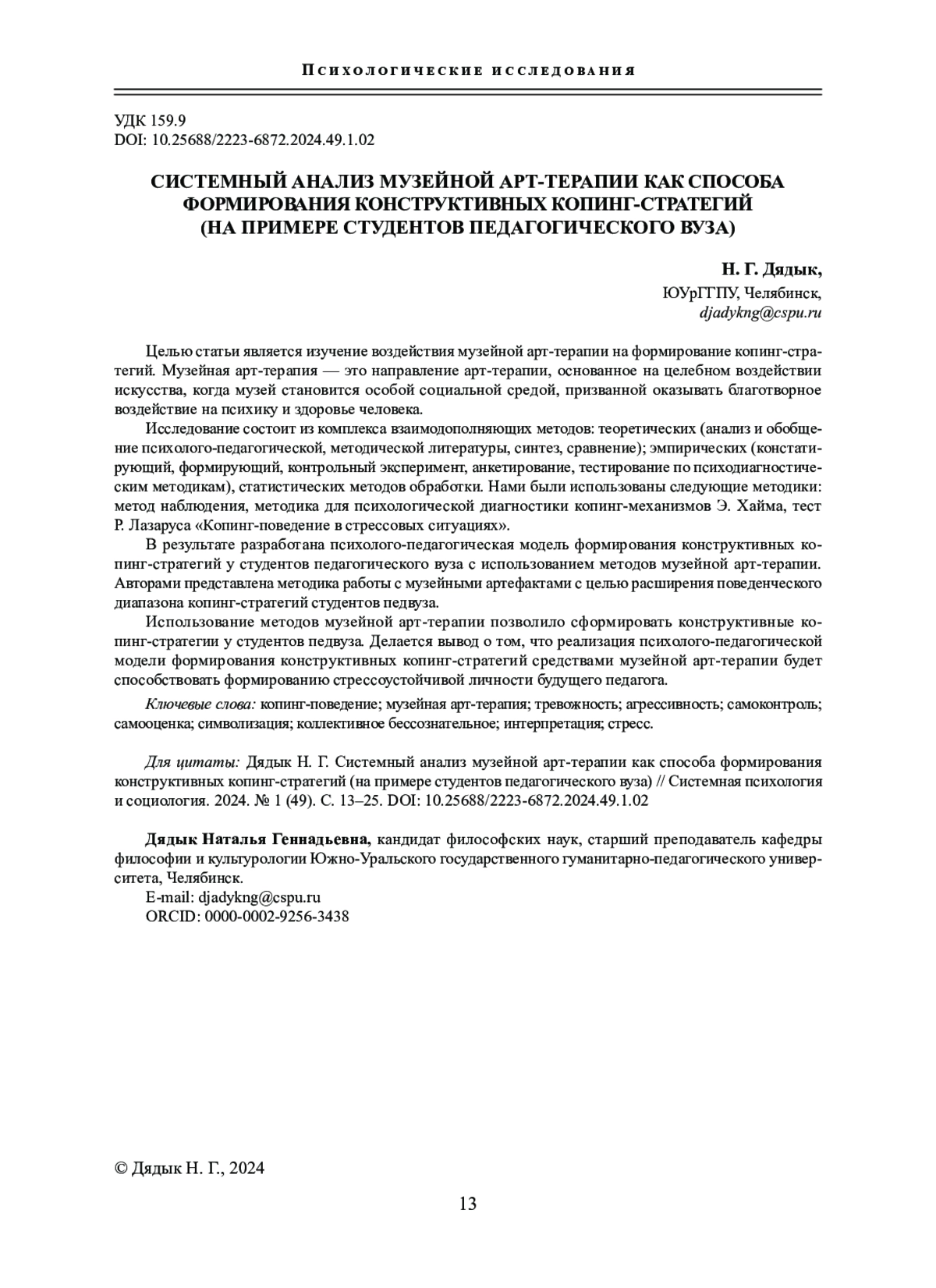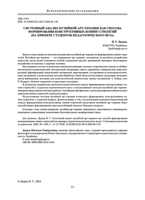 ДЯДЫК Н. Г. СИСТЕМНЫЙ АНАЛИЗ МУЗЕЙНОЙ АРТ-ТЕРАПИИ КАК СПОСОБА ФОРМИРОВАНИЯ КОНСТРУКТИВНЫХ КОПИНГ-СТРАТЕГИЙ (НА ПРИМЕРЕ СТУДЕНТОВ ПЕДАГОГИЧЕСКОГО ВУЗА) // СИСТЕМНАЯ ПСИХОЛОГИЯ И СОЦИОЛОГИЯ. 2024. № 1 (49)