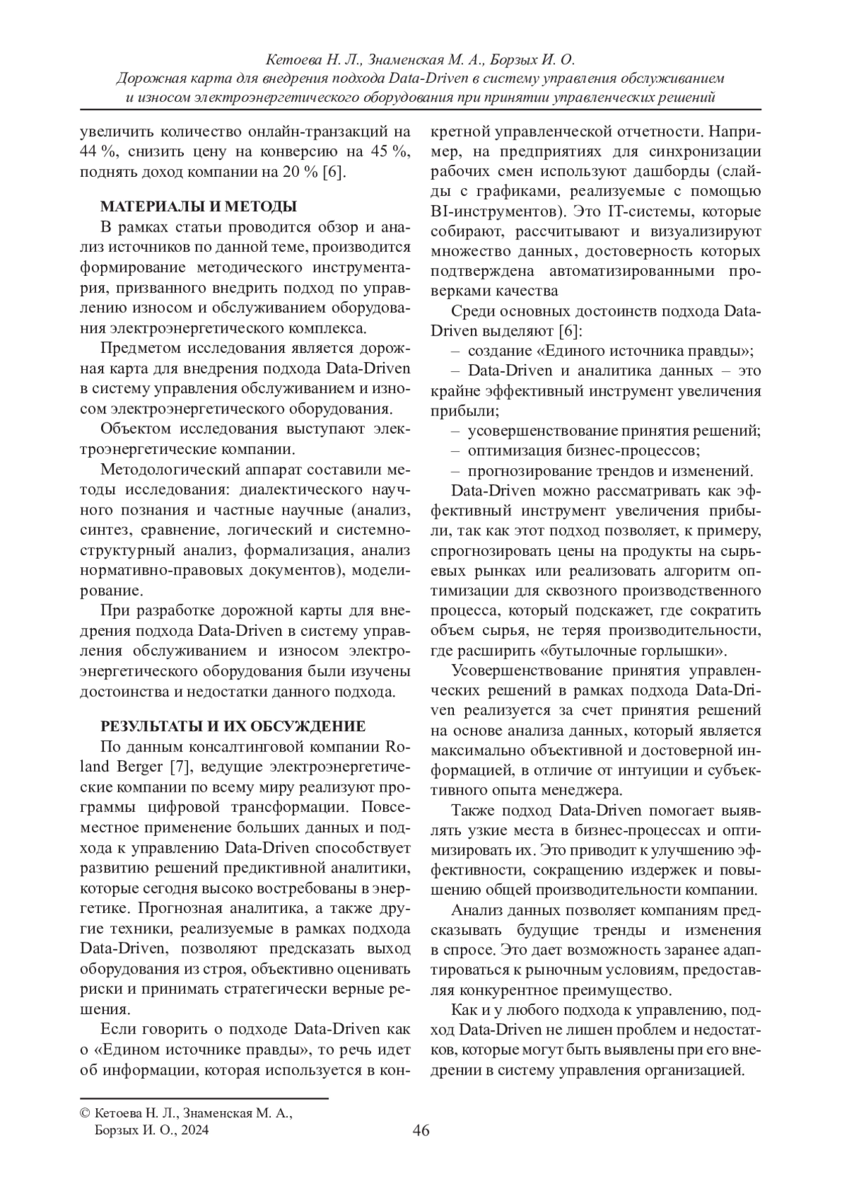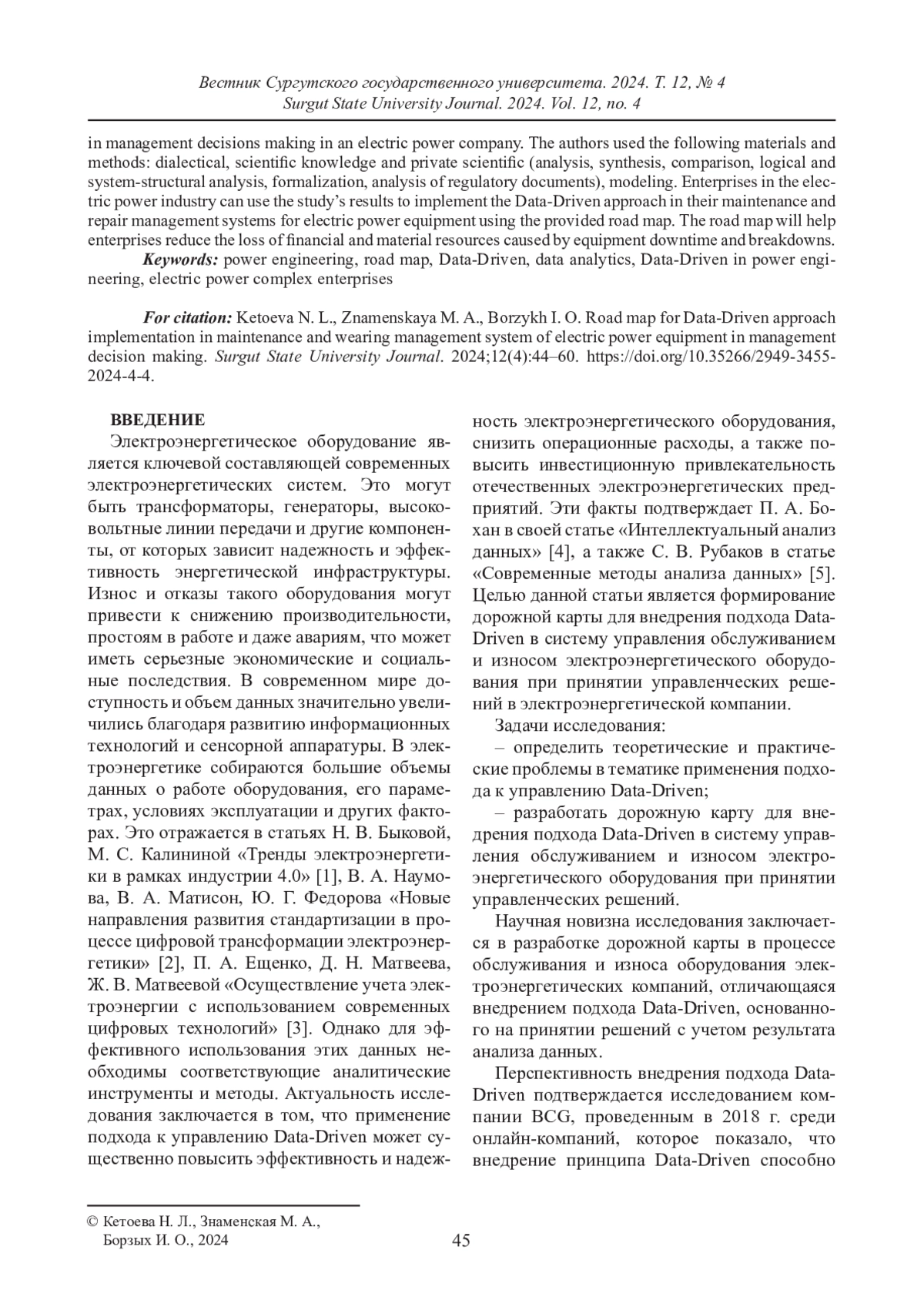 Целью исследования является формирование дорожной карты для внедрения подхода Data-Driven в систему управления обслуживанием и износом электроэнергетического оборудования при принятии управленческих решений в электроэнергетической компании. Предмет исследования – подход Data-Driven в системе управления обслуживанием и износом электроэнергетического оборудования. Методологическую базу исследования составили материалы и методы: диалектический, научного познания и частные научные (анализ, синтез, сравнение, логический и системно-структурный анализ, формализация, анализ нормативно-правовых документов), моделирование. Результаты исследования помогут предприятиям электроэнергетической отрасли внедрять подход к управлению Data-Driven в систему управления обслуживанием и ремонтом электроэнергетического оборудования с использованием представленной дорожной карты. Дорожная карта поможет предприятиям снизить потерю финансовых и материальных ресурсов, вызванную простоем и поломками оборудования.