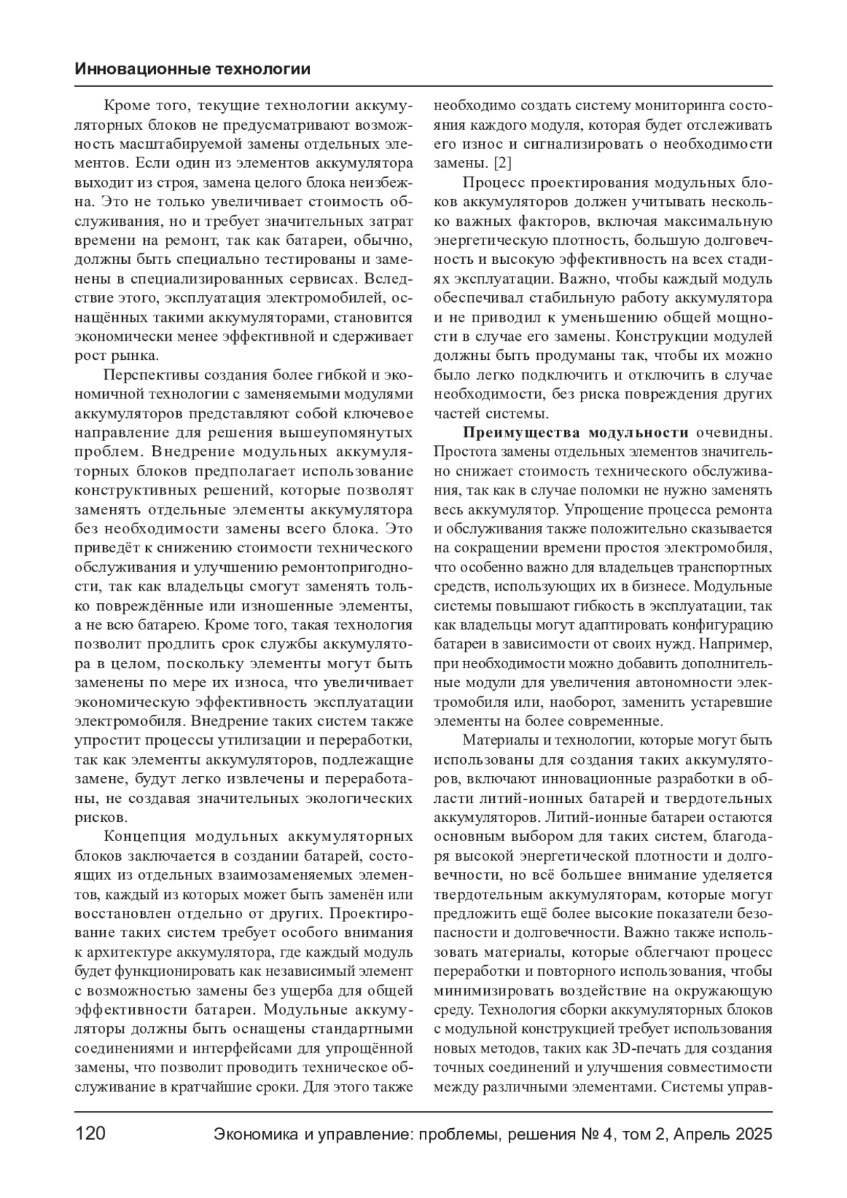 Разработка модульных и легко заменяемых аккумуляторных блоков для электромобилей обещает значительные улучшения в экономике технического обслуживания и переработки батарей. В данной статье рассматриваются преимущества использования модульных аккумуляторов, включая снижение затрат на обслуживание, улучшение доступности ремонта и создание вторичного рынка для компонентов аккумуляторов. Проектирование таких блоков открывает новые возможности для продления срока службы аккумуляторов и упрощения процесса их утилизации. Статья анализирует влияние модульной конструкции на снижение эксплуатационных расходов, создание гибкости в замене элементов и потенциал для создания устойчивых экономических моделей в индустрии электромобилей. Результаты показывают, что переход на модульные аккумуляторы может привести к снижению общей стоимости владения электромобилем и усилению вторичного рынка переработки батарей.