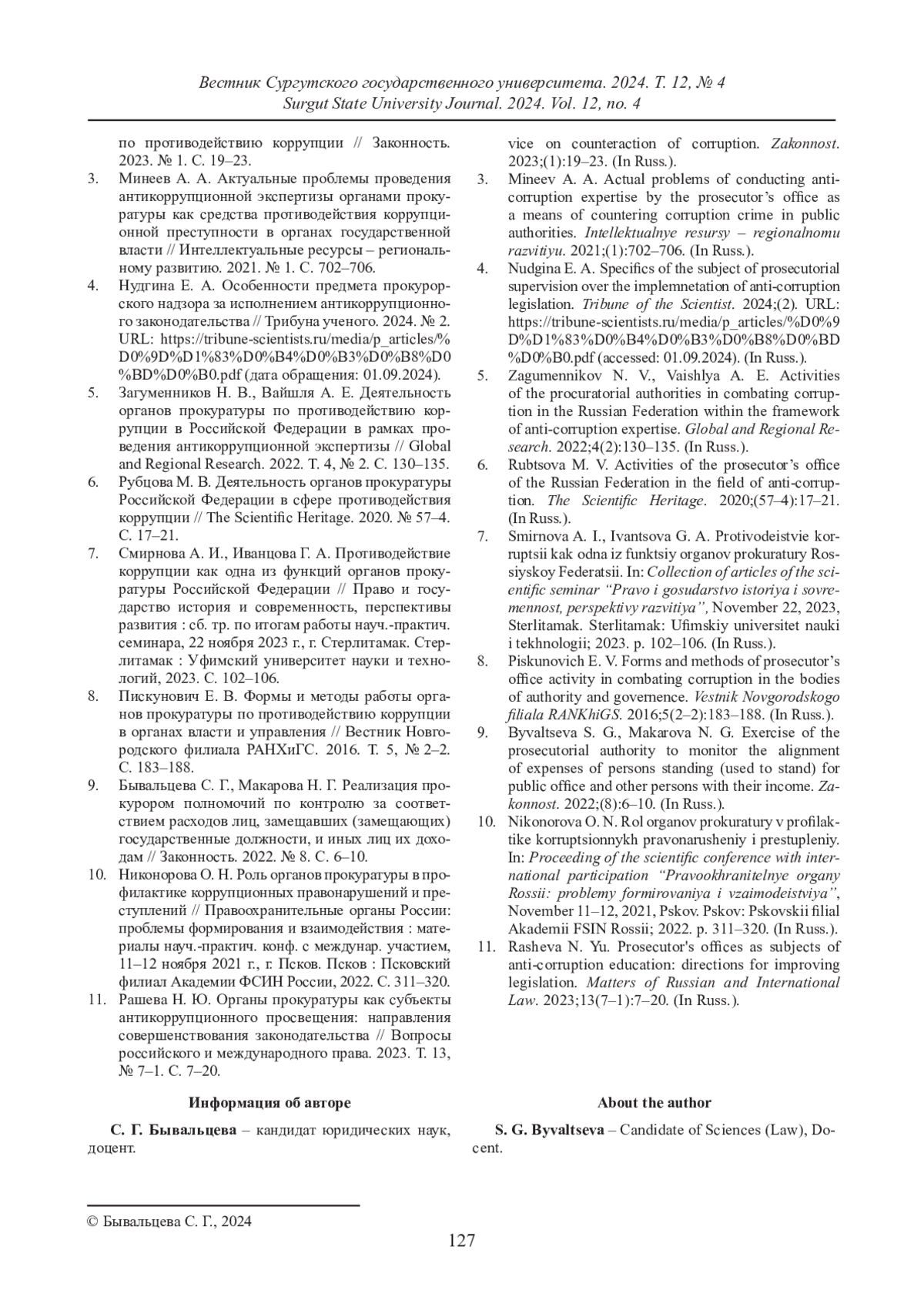 11. Рашева Н. Ю. Органы прокуратуры как субъекты антикоррупционного просвещения: направления совершенствования законодательства // Вопросы российского и международного права. 2023. Т. 13, № 7-1. С. 7-20.