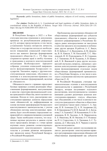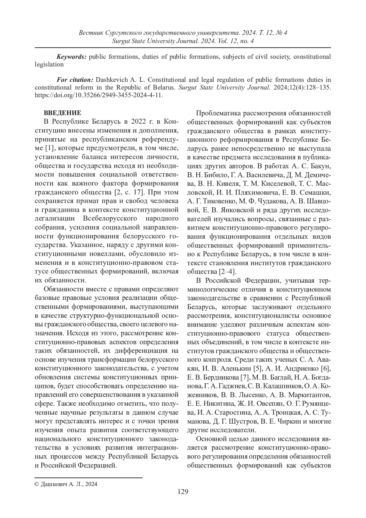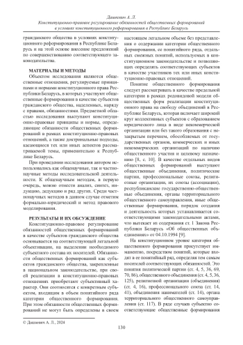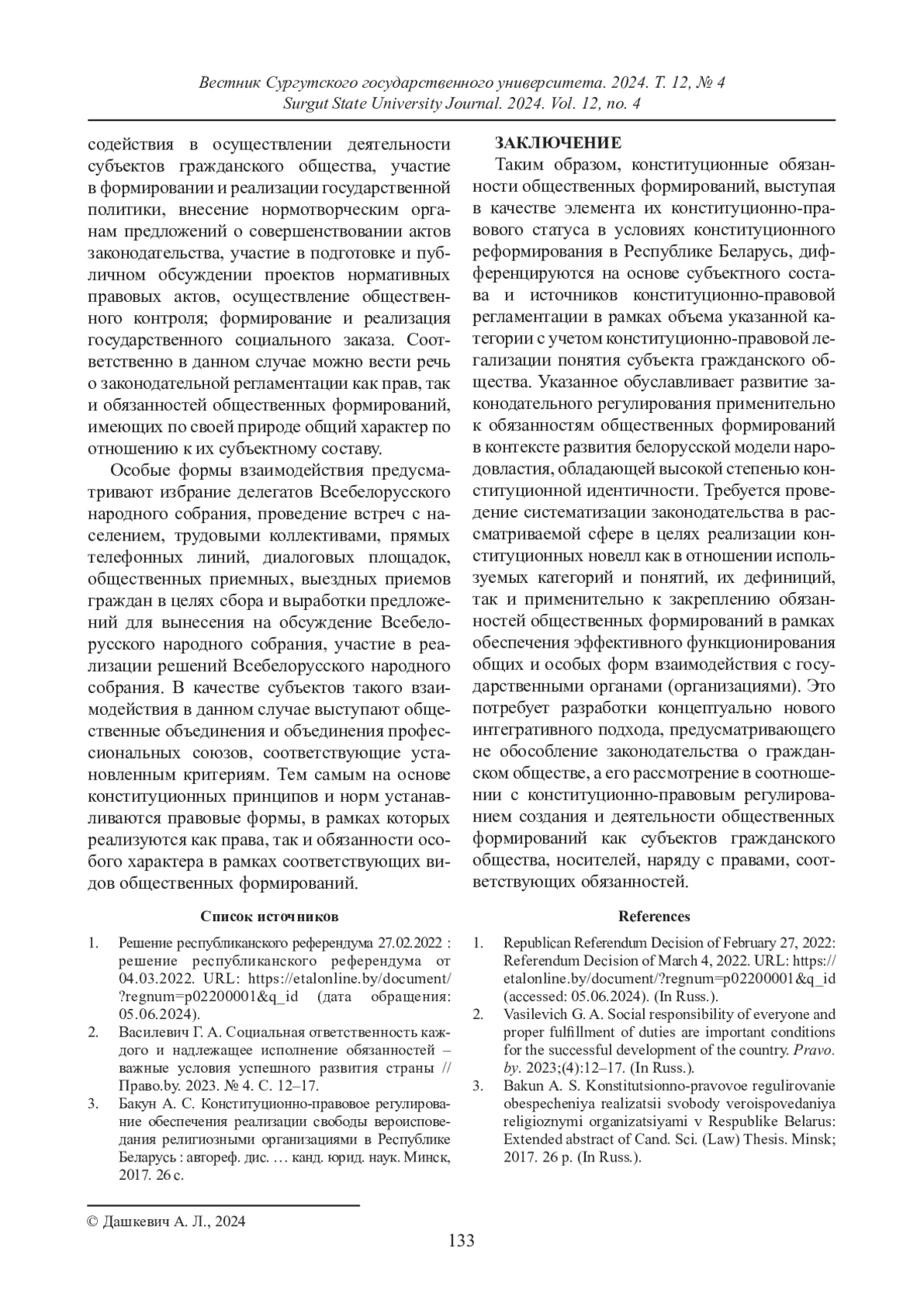 8. Дашкевіч А. Л. Выкарыстанне паняцця грамадскага фарміравання ў канстытуцыйна-прававым рэгуляванні ў Рэспубліцы Беларусь // Сацыяльна-эканамічныя і прававыя даследаванні. 2021. № 2. С. 4-12.