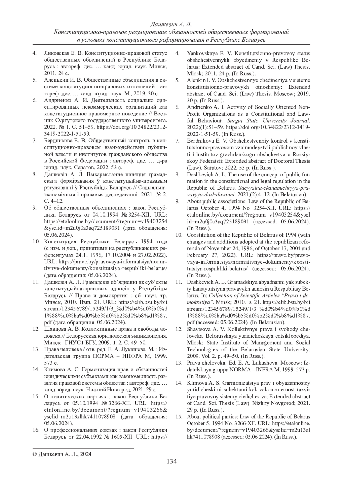 11. Дашкевіч А. Л. Грамадскія аб’яднанні як суб’екты канстытуцыйна-прававых адносін у Рэспубліцы Беларусь // Право и демократия : сб. науч. тр. Минск, 2010. Вып. 21. URL: https://elib.bsu.by/bitstream/123456789/15249/1/3_дашкевич.pdf (дата обращения: 05.06.2024).