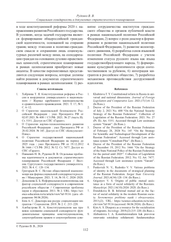 В статье проанализирована роль концепта социальной солидарности в документах стратегического планирования по признаку целеполагания на федеральном уровне. Статья подготовлена на основе сочетания общенаучных методов и специальных частноправовых методов. Операционализация аксиологических оценок осуществлена на основе политико-правового анализа. Сделан вывод о том, что действующие документы стратегического планирования отвечают основным векторам развития российского государства, заданным в ходе конституционной реформы 2020 г. Концепт солидарности тесным образом связан с понятием гражданского самосознания и составляющими его идеологемами. Сформулированы вопросы, требующие разрешения на законодательном уровне в целях повышения уровня солидарности в российском обществе.