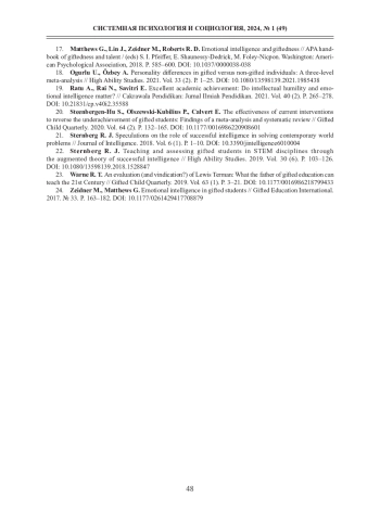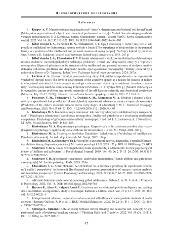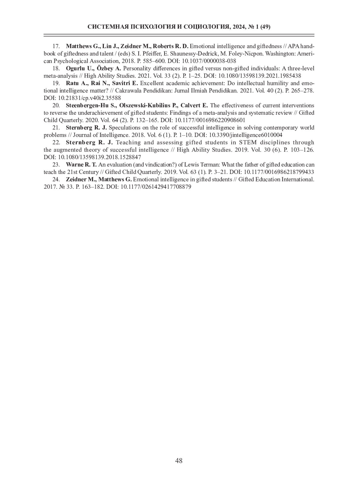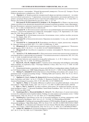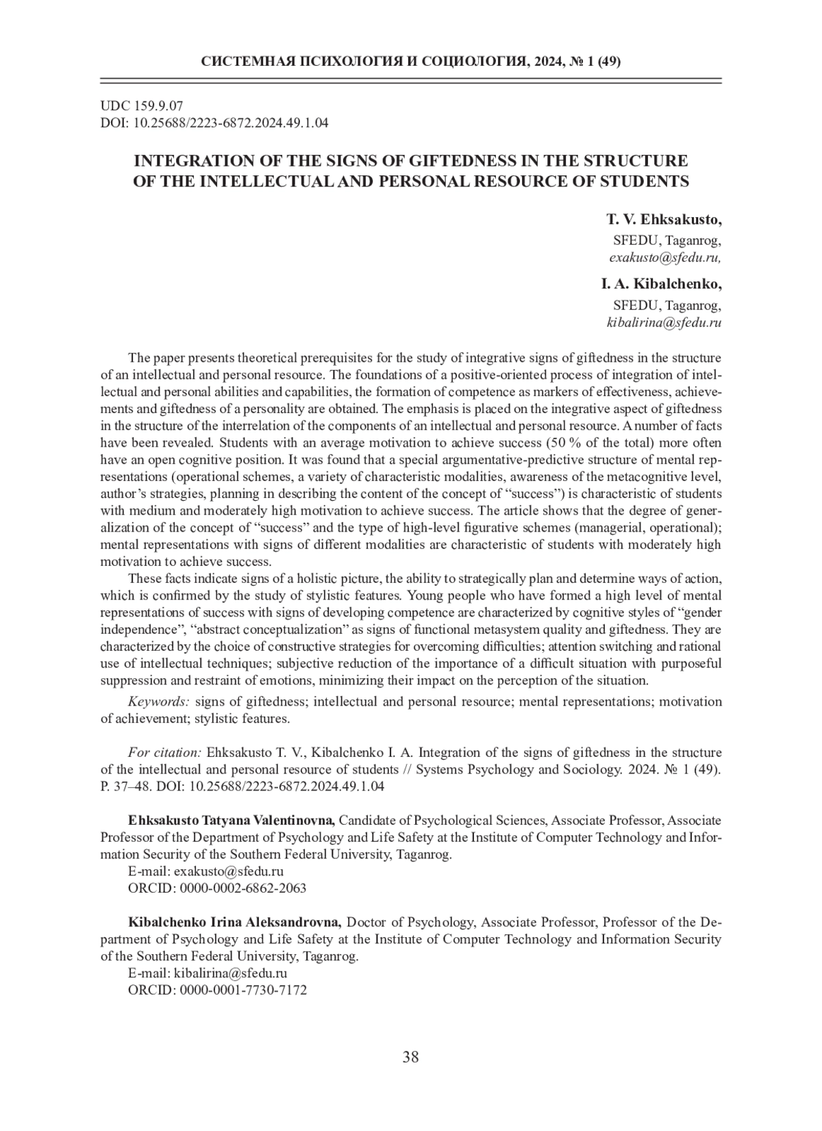 ЭКСАКУСТО Т. В., КИБАЛЬЧЕНКО И. А. ИНТЕГРАЦИЯ ПРИЗНАКОВ ОДАРЕННОСТИ В СТРУКТУРЕ ИНТЕЛЛЕКТУАЛЬНО-ЛИЧНОСТНОГО РЕСУРСА СТУДЕНТОВ // СИСТЕМНАЯ ПСИХОЛОГИЯ И СОЦИОЛОГИЯ. 2024. № 1 (49)