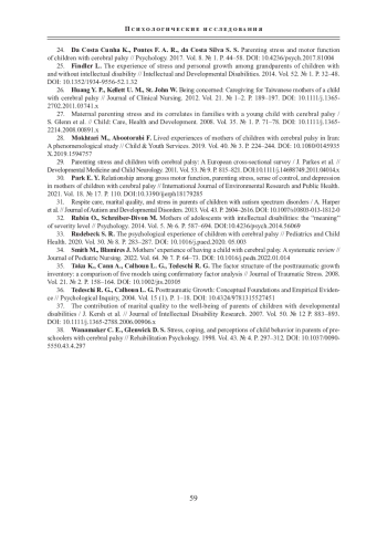 3. Ким К. А., Кадыров Р. В. Родительский стресс и воспитание ребенка с детским церебральным параличом: обзор зарубежных исследований // Клиническая и специальная психология. 2022. Т. 11. № 4. С. 1-29. DOI: 10.17759/cpse.2022110401 EDN: QDTHGF