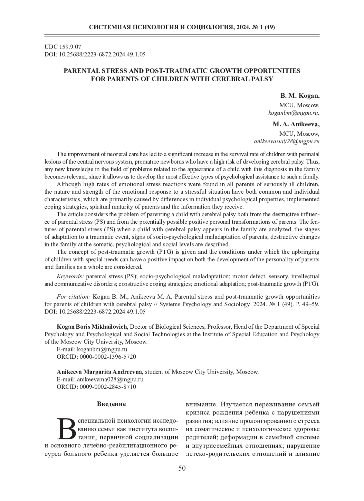 11. Сергиенко А. И. Эмоциональная дезадаптация и посттравматический рост родителя ребенка с ОВЗ: связь с субъективным восприятием тяжести симптоматики и с возрастом ребенка // Клиническая и специальная психология. 2019. Т. 8. № 4. С. 93-106. DOI: 10.17759/cpse.2019080406 EDN: BVYQVH