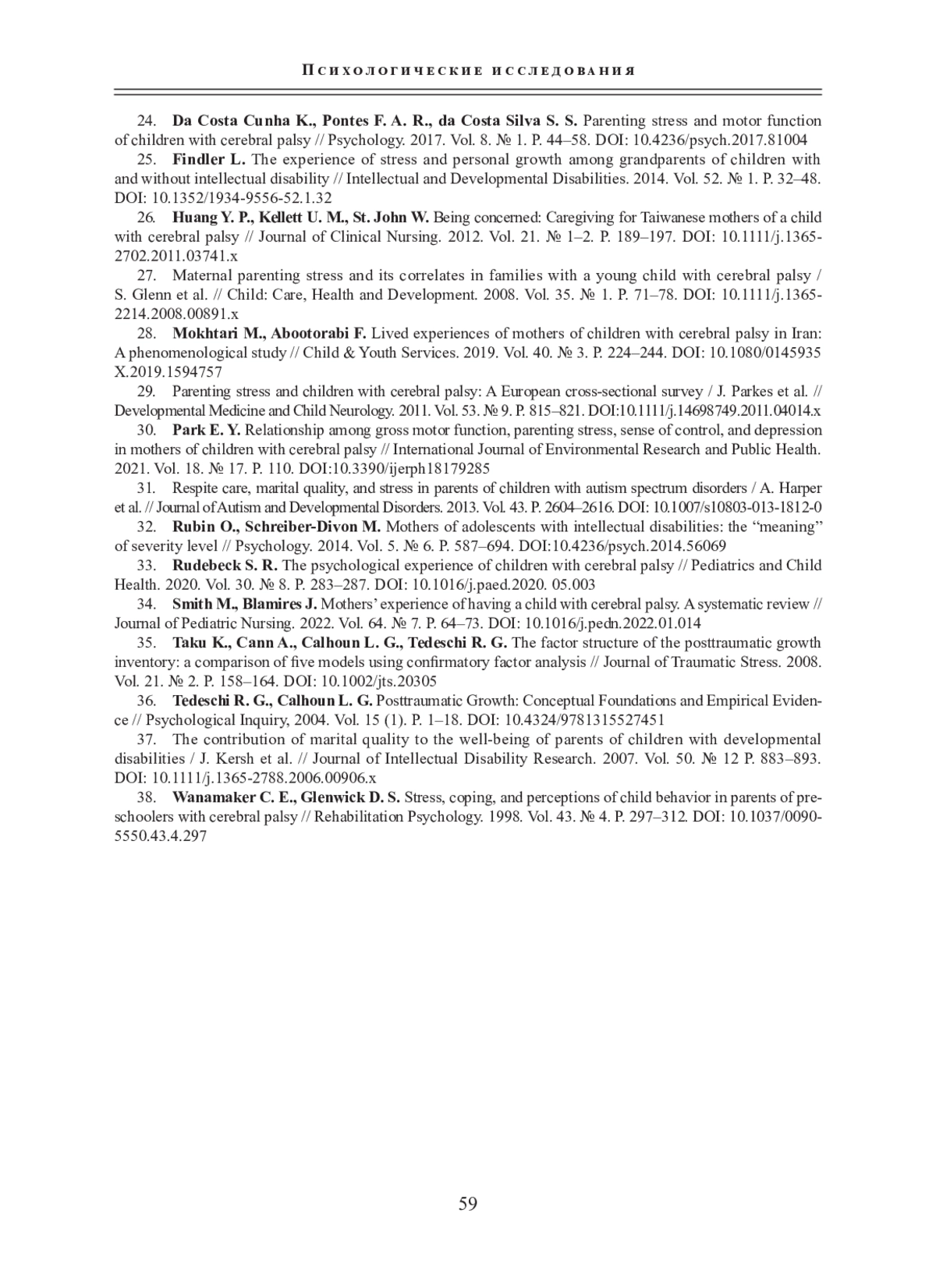 24. Da Costa Cunha K., Pontes F. A. R., da Costa Silva S. S. Parenting stress and motor function of children with cerebral palsy // Psychology. 2017. Vol. 8. № 1. P. 44-58. DOI: 10.4236/psych.2017.81004