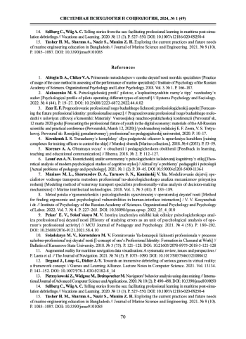 2. Алексеенко М. С. Психологический профиль пилотов, эксплуатирующих разные типы воздушных судов // Системная психология и социология. 2022. № 4 (44). С. 19-27. DOI: 10.25688/22236872.2022.44.4.02 EDN: RDGKRF