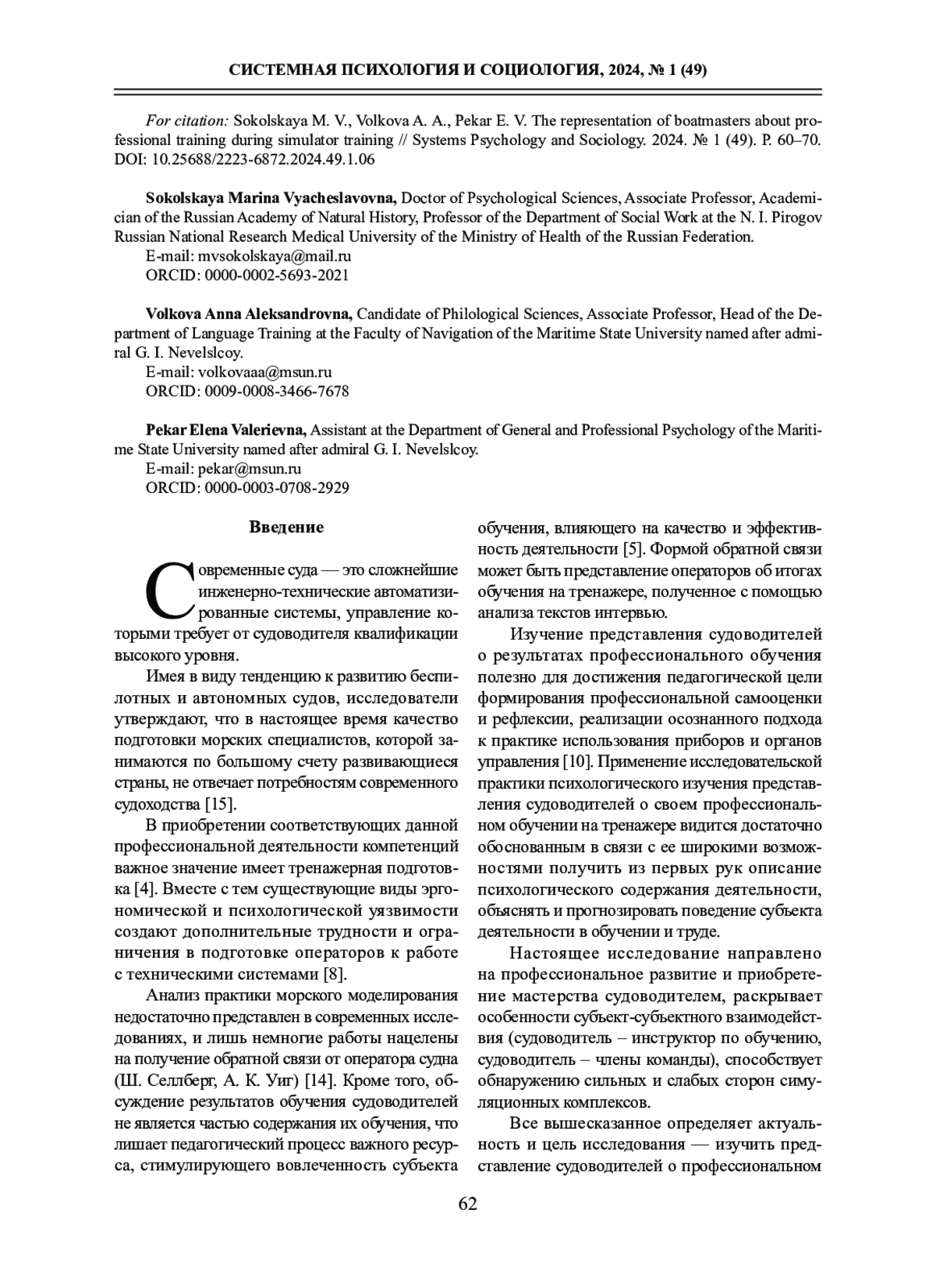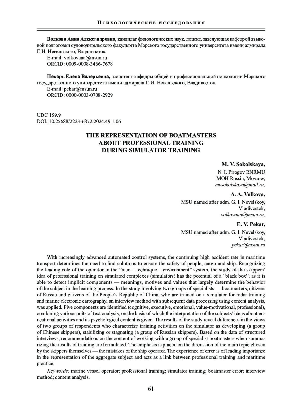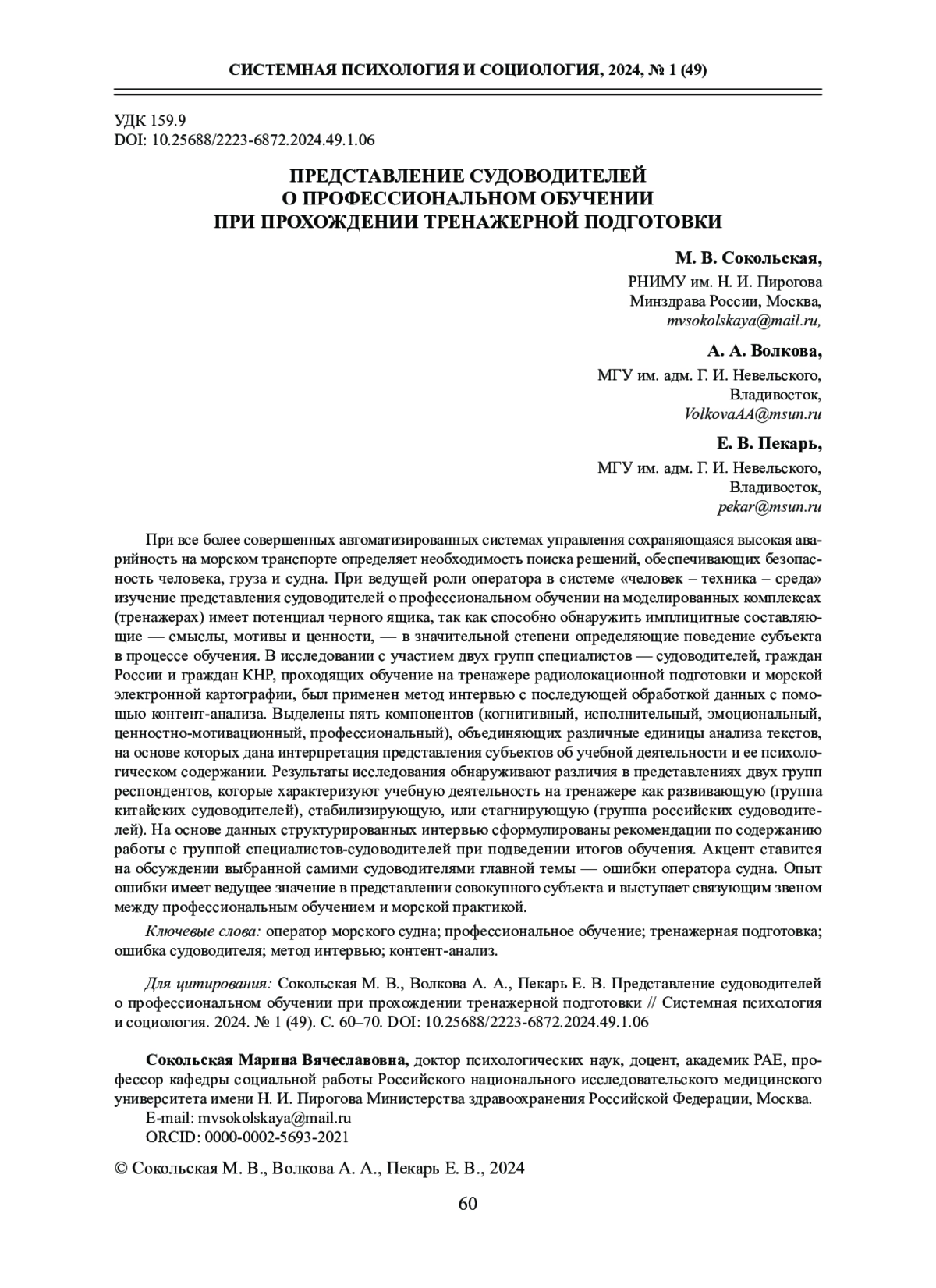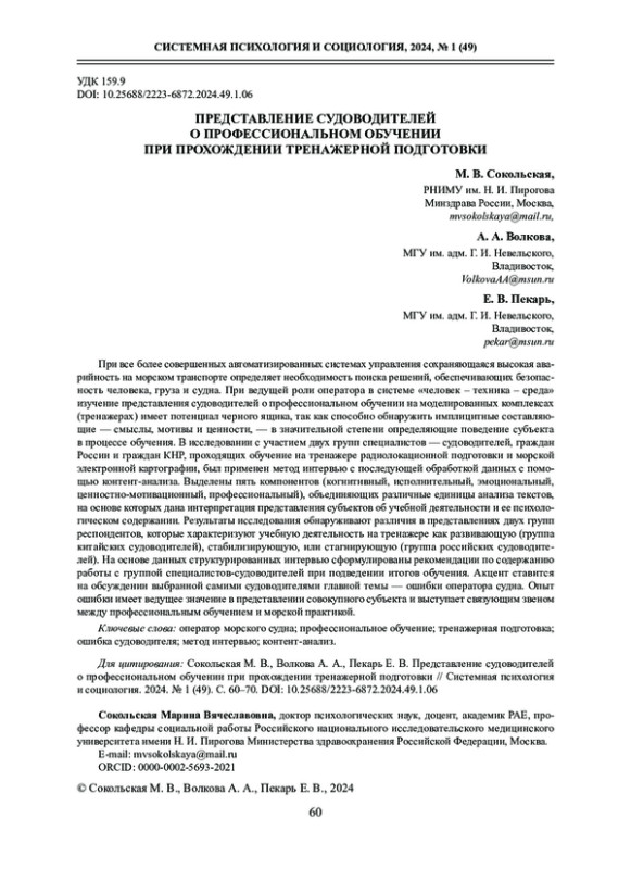 При все более совершенных автоматизированных системах управления сохраняющаяся высокая аварийность на морском транспорте определяет необходимость поиска решений, обеспечивающих безопасность человека, груза и судна. При ведущей роли оператора в системе «человек - техника - среда» изучение представления судоводителей о профессиональном обучении на моделированных комплексах (тренажерах) имеет потенциал черного ящика, так как способно обнаружить имплицитные составляющие - смыслы, мотивы и ценности, - в значительной степени определяющие поведение субъекта в процессе обучения. В исследовании с участием двух групп специалистов - судоводителей, граждан России и граждан КНР, проходящих обучение на тренажере радиолокационной подготовки и морской электронной картографии, был применен метод интервью с последующей обработкой данных с помощью контент-анализа. Выделены пять компонентов (когнитивный, исполнительный, эмоциональный, ценностно-мотивационный, профессиональный), объединяющих различные единицы анализа текстов, на основе которых дана интерпретация представления субъектов об учебной деятельности и ее психологическом содержании. Результаты исследования обнаруживают различия в представлениях двух групп респондентов, которые характеризуют учебную деятельность на тренажере как развивающую (группа китайских судоводителей), стабилизирующую, или стагнирующую (группа российских судоводителей). На основе данных структурированных интервью сформулированы рекомендации по содержанию работы с группой специалистов-судоводителей при подведении итогов обучения. Акцент ставится на обсуждении выбранной самими судоводителями главной темы - ошибки оператора судна. Опыт ошибки имеет ведущее значение в представлении совокупного субъекта и выступает связующим звеном между профессиональным обучением и морской практикой.