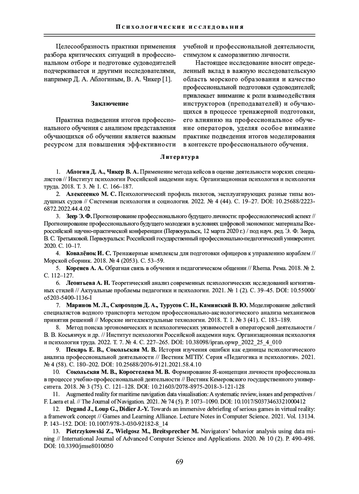 1. Аблогин Д. А., Чикер В. А. Применение метода кейсов в оценке деятельности морских специалистов // Институт психологии Российской академии наук. Организационная психология и психология труда. 2018. Т. 3. № 1. С. 166-187. EDN: YUMRUJ