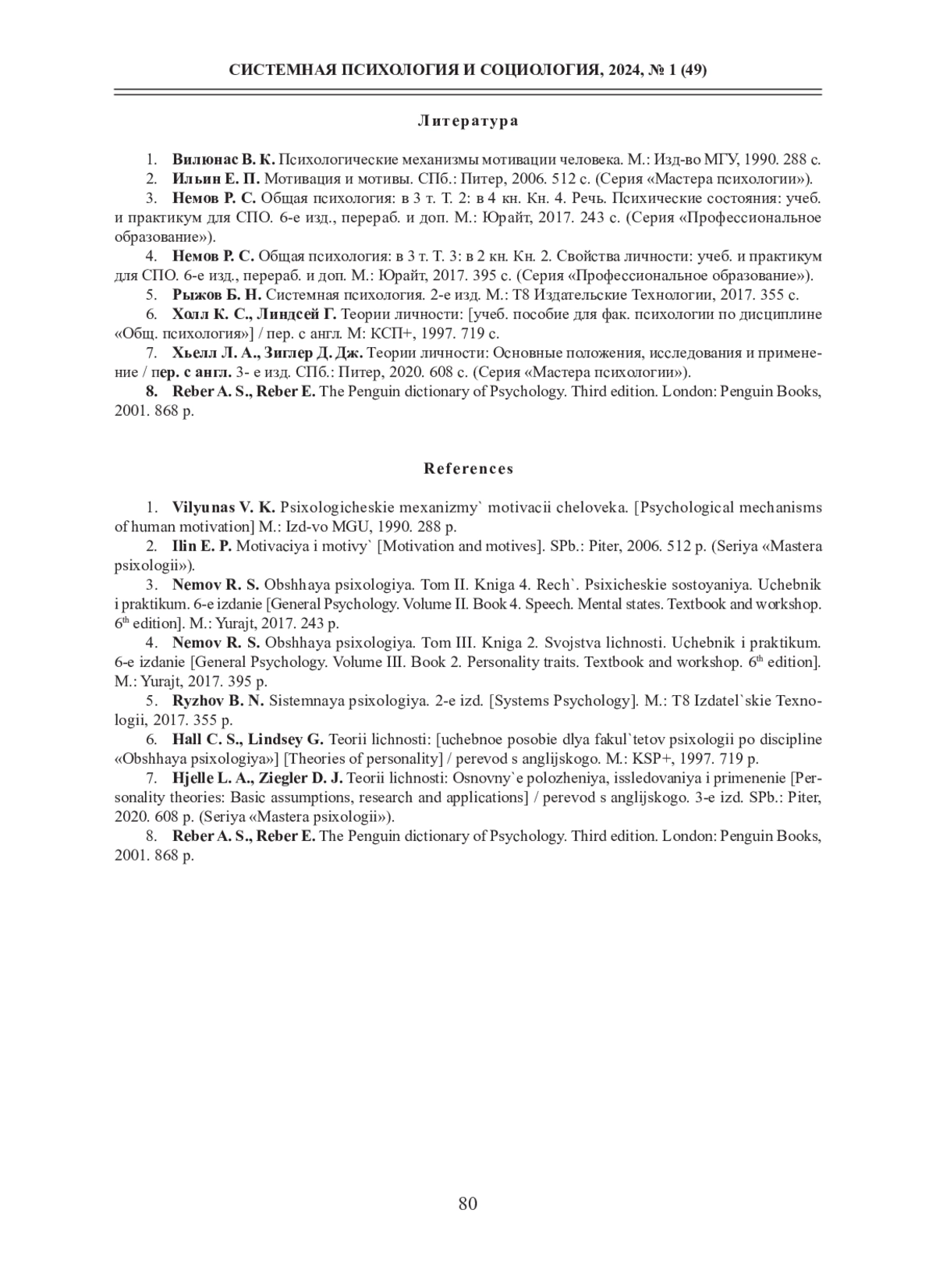 1. Вилюнас В. К. Психологические механизмы мотивации человека. М.: Изд-во МГУ, 1990. 288 с. EDN: ZJOUTH