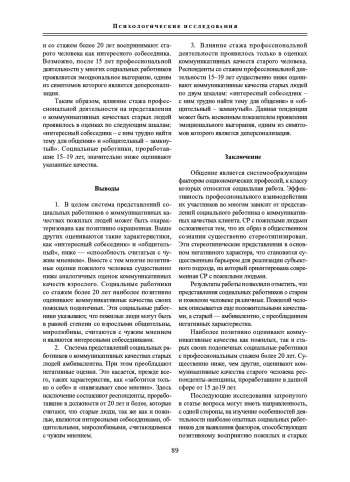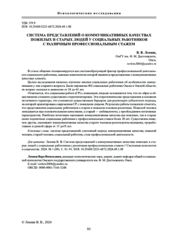 Отмечается, что социальная работа (СР) с пожилыми людьми осложняется тем, что их образ в общественном сознании существенно стереотипизирован. Эти стереотипические представления в основном негативного характера, что становится существенным барьером для реализации субъектного подхода, на который ориентирована современная СР с пожилыми людьми. Результаты работы позволили отметить, что представления социальных работников о старом и пожилом человеке различные. Пожилой человек описывается еще положительными качествами, а старый - амбивалентно, с преобладанием негативных характеристик. Наиболее позитивно оценивают коммуникативные качества как пожилых, так и старых своих подопечных социальные работники с профессиональным стажем более 20 лет. Существенно ниже, чем другие, оценивают коммуникативные качества старого человека респонденты-женщины, проработавшие в данной сфере от 15 до19 лет.