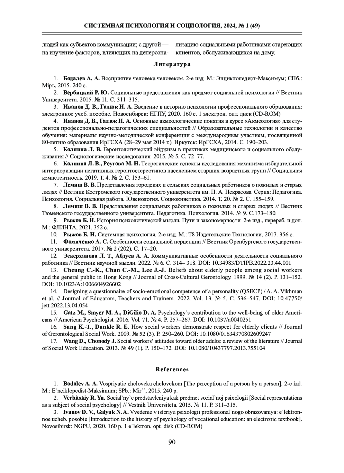 6. Колпина Л. В., Реутова М. Н. Теоретические аспекты исследования механизма избирательной интериоризации негативных геронтостереотипов населением старших возрастных групп // Социальная компетентность. 2019. Т. 4. № 2. C. 153-61. EDN: MUDAHM