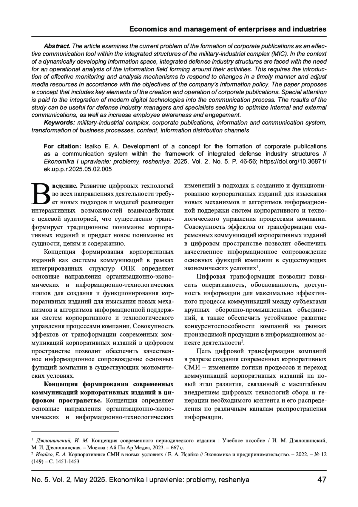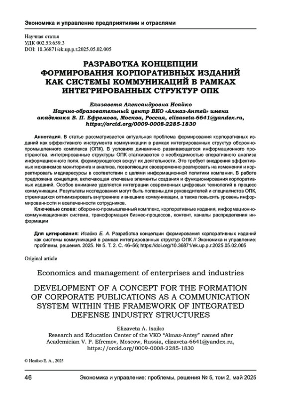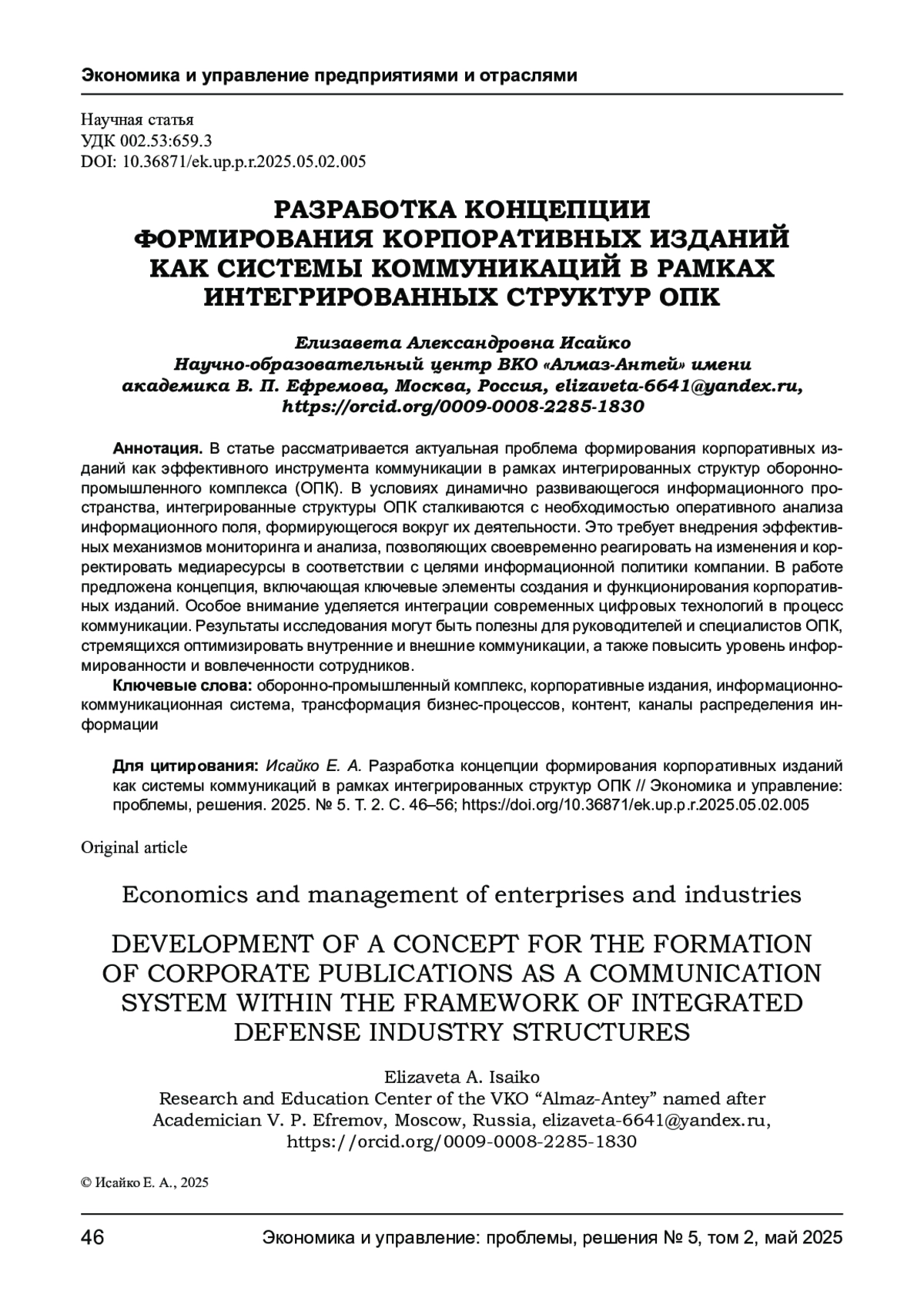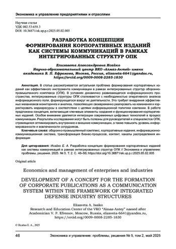 ИСАЙКО Е. А. РАЗРАБОТКА КОНЦЕПЦИИ ФОРМИРОВАНИЯ КОРПОРАТИВНЫХ ИЗДАНИЙ КАК СИСТЕМЫ КОММУНИКАЦИЙ В РАМКАХ ИНТЕГРИРОВАННЫХ СТРУКТУР ОПК // ЭКОНОМИКА И УПРАВЛЕНИЕ: ПРОБЛЕМЫ, РЕШЕНИЯ. 2025. ТОМ 2 № 5