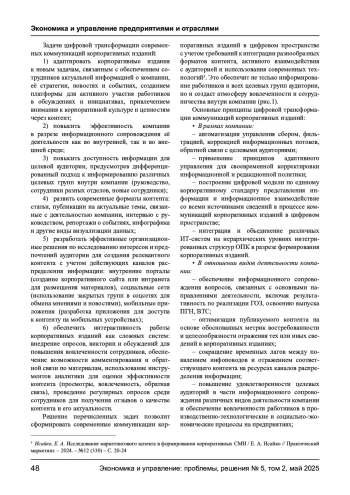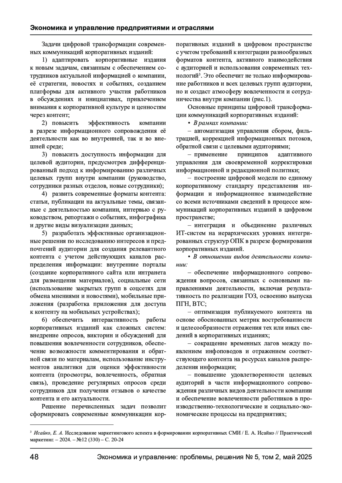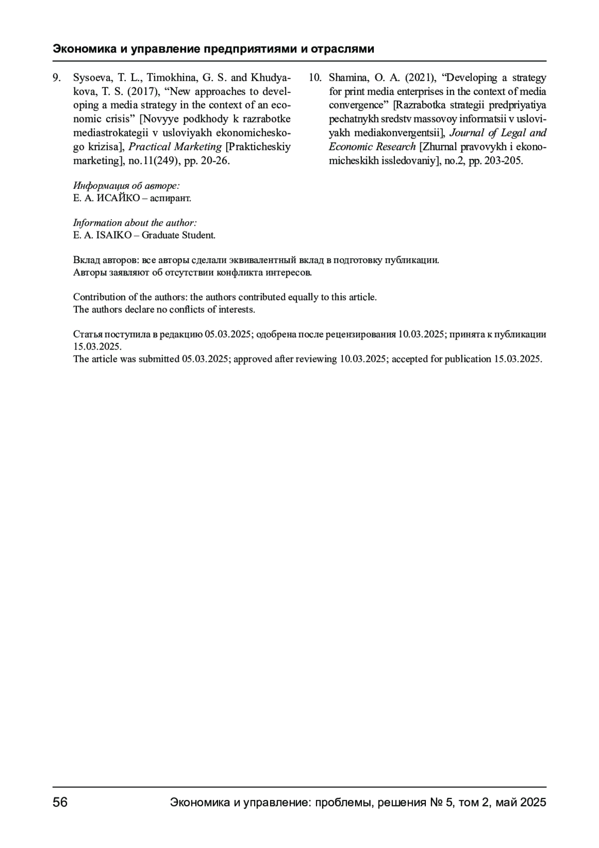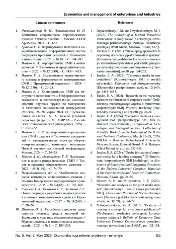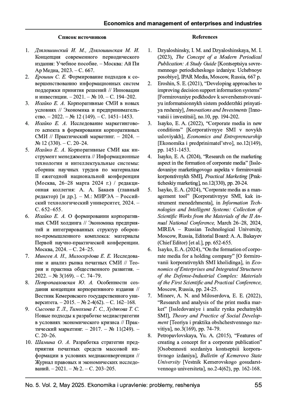 ИСАЙКО Е. А. РАЗРАБОТКА КОНЦЕПЦИИ ФОРМИРОВАНИЯ КОРПОРАТИВНЫХ ИЗДАНИЙ КАК СИСТЕМЫ КОММУНИКАЦИЙ В РАМКАХ ИНТЕГРИРОВАННЫХ СТРУКТУР ОПК // ЭКОНОМИКА И УПРАВЛЕНИЕ: ПРОБЛЕМЫ, РЕШЕНИЯ. 2025. ТОМ 2 № 5