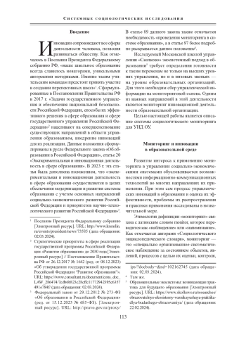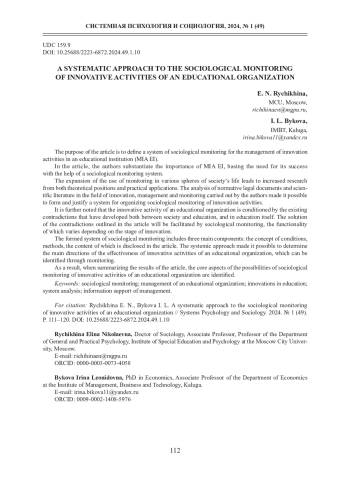 Сформированная система социологического мониторинга включает три основных компонента: концепцию, условия, методы, - содержание которых раскрывается в статье. Системный подход позволил определить основные направления результативности инновационной деятельности образовательной организации, которые можно выявить при помощи мониторинга.