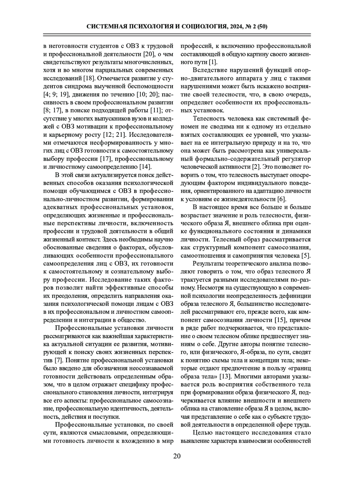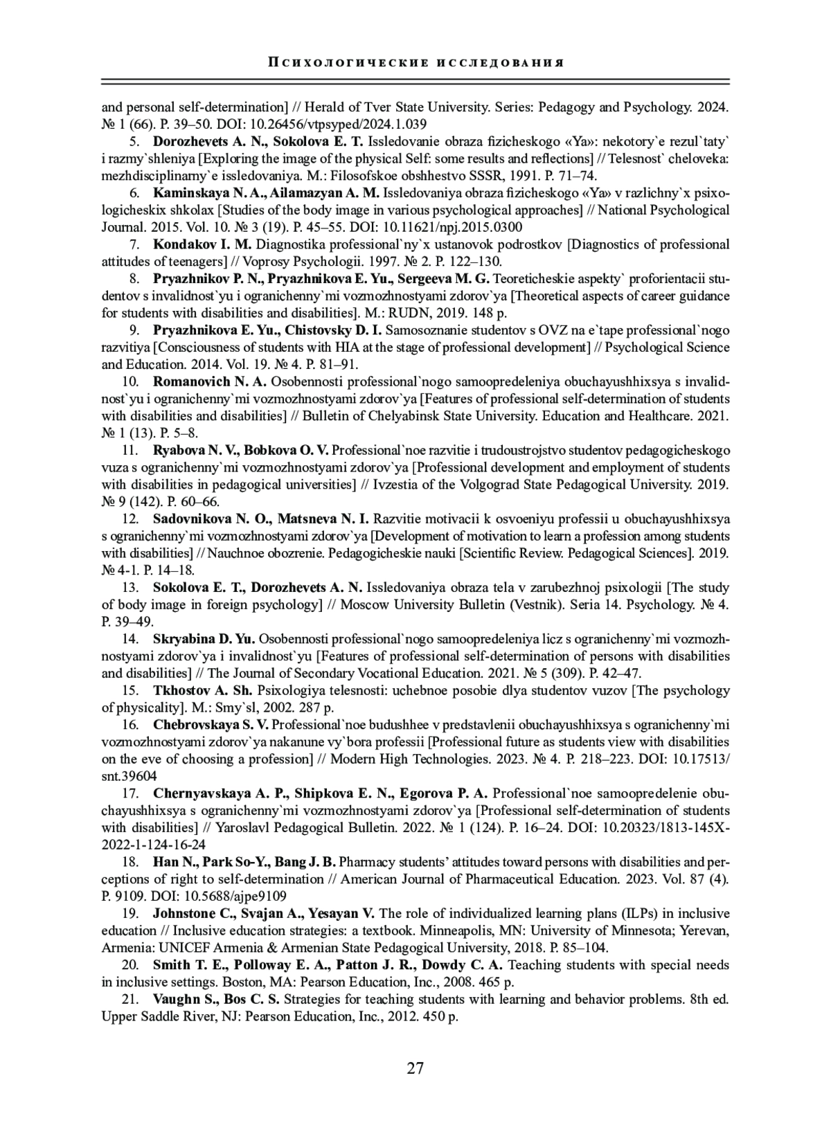 9. Пряжникова Е. Ю., Чистовский Д. И. Самосознание студентов с ОВЗ на этапе профессионального развития // Психологическая наука и образование. 2014. Т. 19. № 4. С. 81-91. EDN: TDYBWF