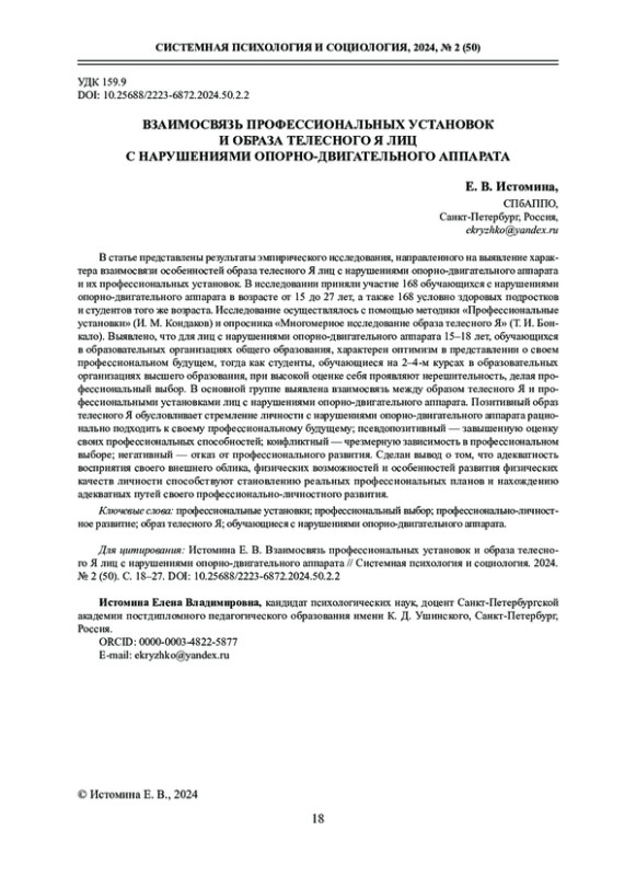 В статье представлены результаты эмпирического исследования, направленного на выявление характера взаимосвязи особенностей образа телесного Я лиц с нарушениями опорно-двигательного аппарата и их профессиональных установок. В исследовании приняли участие 168 обучающихся с нарушениями опорно-двигательного аппарата в возрасте от 15 до 27 лет, а также 168 условно здоровых подростков и студентов того же возраста. Исследование осуществлялось с помощью методики «Профессиональные установки» (И. М. Кондаков) и опросника «Многомерное исследование образа телесного Я» (Т. И. Бонкало). Выявлено, что для лиц с нарушениями опорно-двигательного аппарата 15-18 лет, обучающихся в образовательных организациях общего образования, характерен оптимизм в представлении о своем профессиональном будущем, тогда как студенты, обучающиеся на 2-4-м курсах в образовательных организациях высшего образования, при высокой оценке себя проявляют нерешительность, делая профессиональный выбор. В основной группе выявлена взаимосвязь между образом телесного Я и профессиональными установками лиц с нарушениями опорно-двигательного аппарата. Позитивный образ телесного Я обусловливает стремление личности с нарушениями опорно-двигательного аппарата рационально подходить к своему профессиональному будущему; псевдопозитивный - завышенную оценку своих профессиональных способностей; конфликтный - чрезмерную зависимость в профессиональном выборе; негативный - отказ от профессионального развития. Сделан вывод о том, что адекватность восприятия своего внешнего облика, физических возможностей и особенностей развития физических качеств личности способствуют становлению реальных профессиональных планов и нахождению адекватных путей своего профессионально-личностного развития.