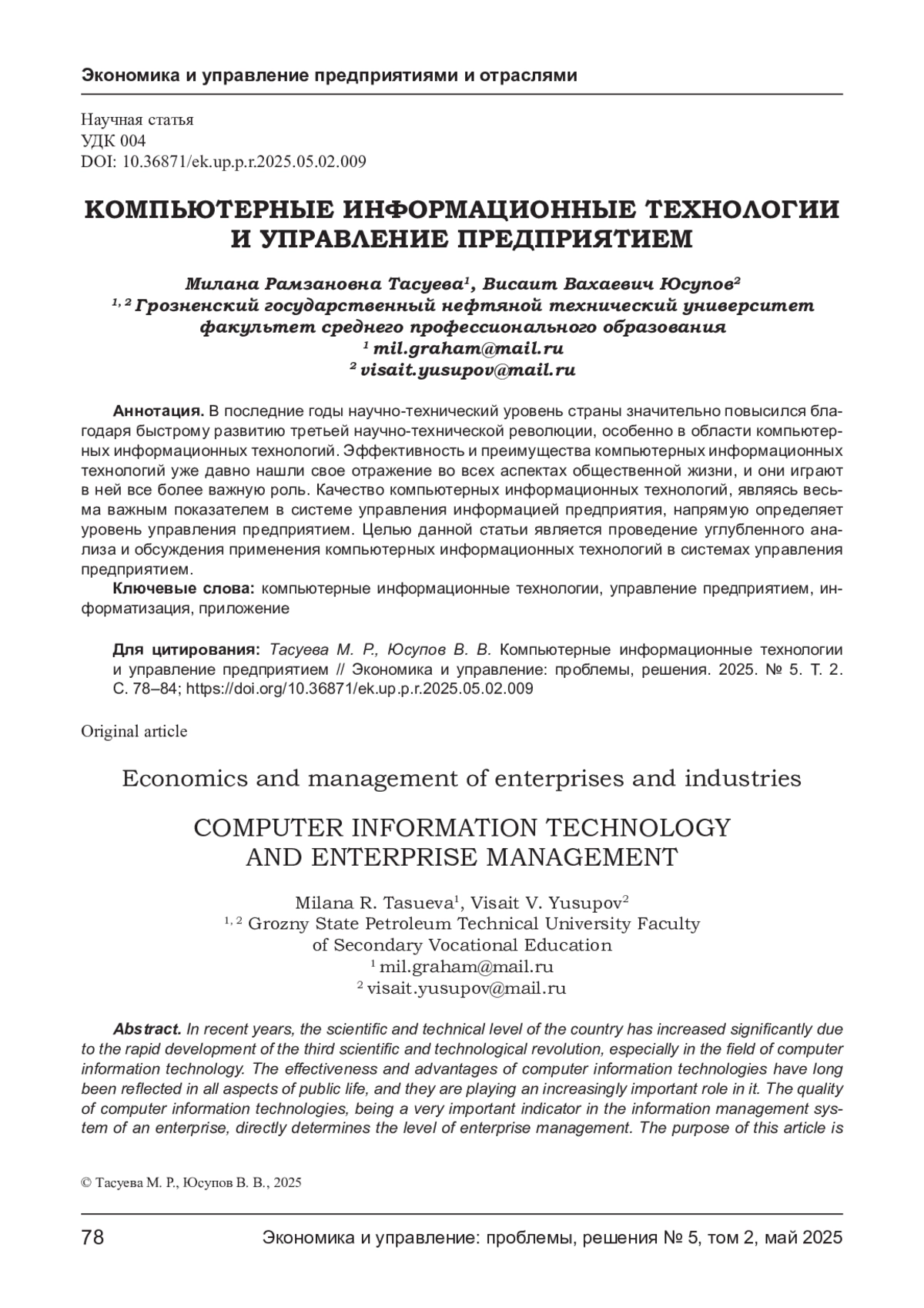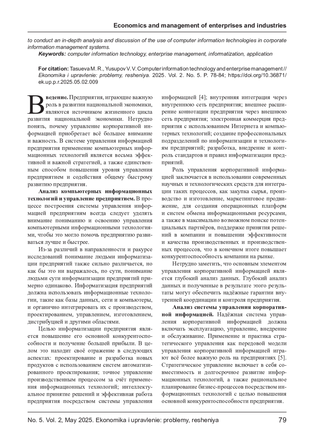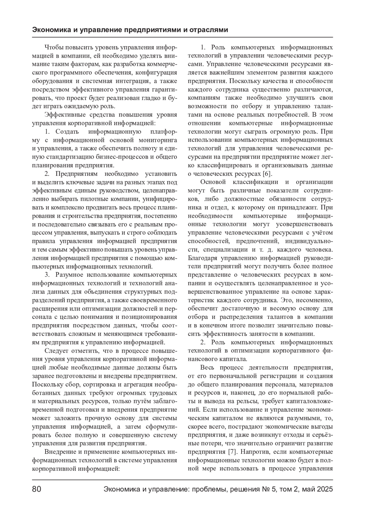 В последние годы научно-технический уровень страны значительно повысился благодаря быстрому развитию третьей научно-технической революции, особенно в области компьютерных информационных технологий. Эффективность и преимущества компьютерных информационных технологий уже давно нашли свое отражение во всех аспектах общественной жизни, и они играют в ней все более важную роль. Качество компьютерных информационных технологий, являясь весьма важным показателем в системе управления информацией предприятия, напрямую определяет уровень управления предприятием. Целью данной статьи является проведение углубленного анализа и обсуждения применения компьютерных информационных технологий в системах управления предприятием.
