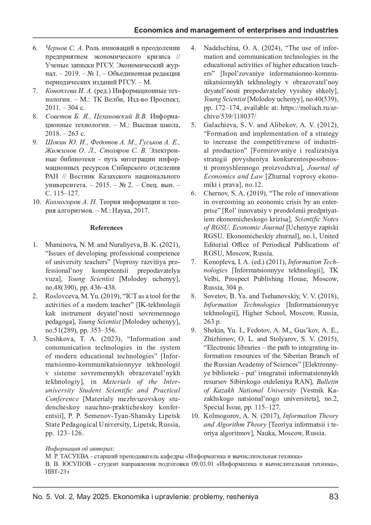 3. Сушкова Т. А. Информационно-коммуникационные технологии в системе современных образовательных технологий // Материалы межвузовской студенческой научно-практической конференции. - Липецк: Липецкий государственный педагогический университет имени П. П. Семенова-Тян-Шанского, 2023. - С. 123-126. EDN: FSEQCX